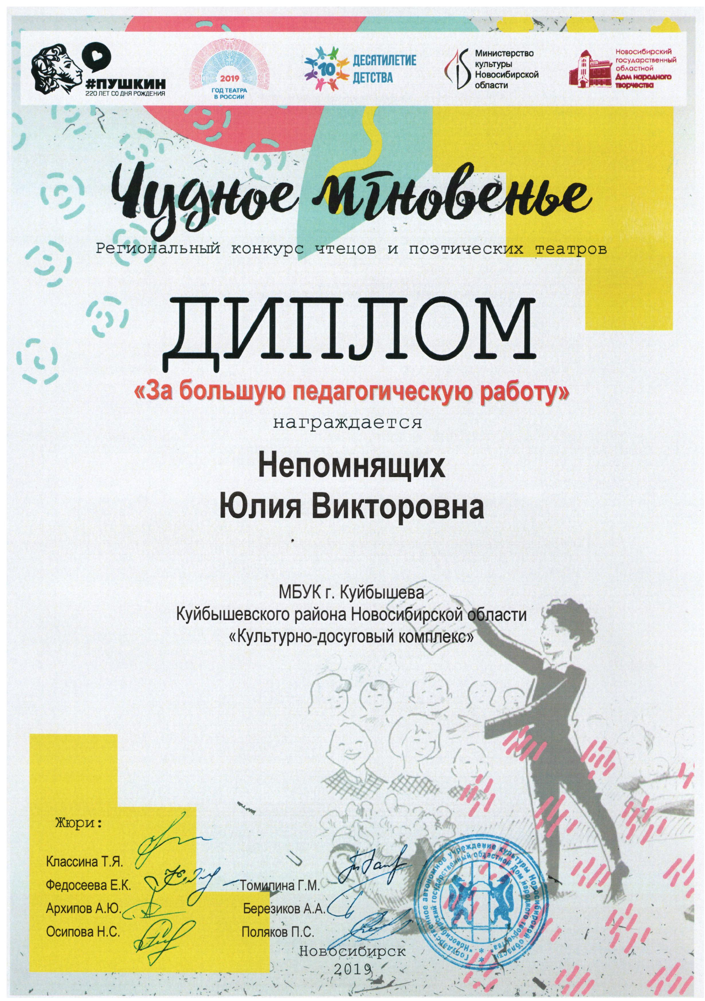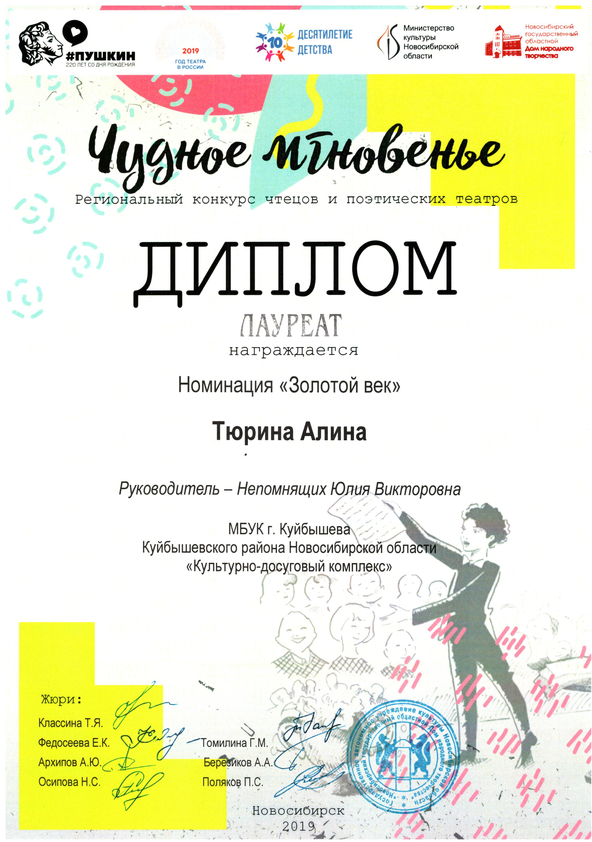 15 июня в Новосибирском государственном областном доме народного творчества состоялся финал регионального конкурса чтецов и поэтических театров «Чудное мгновенье». Мероприятие началось с мастер-класса по сценической речи, который очень увлеченно и эмоционально провела заслуженная артистка РФ, актриса НГАТ «Красный факел» Т. Я. Класина; далее состоялось выступление 14 финалистов и гостей конкурса. Город Куйбышев представляла победительница зонального этапа конкурса — Алина Тюрина, участница театра чтеца «Калейдоскоп слов» МБУК «КДК», руководитель Ю.В. Непомнящих. На церемонии награждения Алине был вручен диплом лауреата, а Юлии Викторовне диплом «За большую педагогическую работу». Поздравляем Алину и Юлию Викторовну! Желаем им дальнейших творческих достижений!