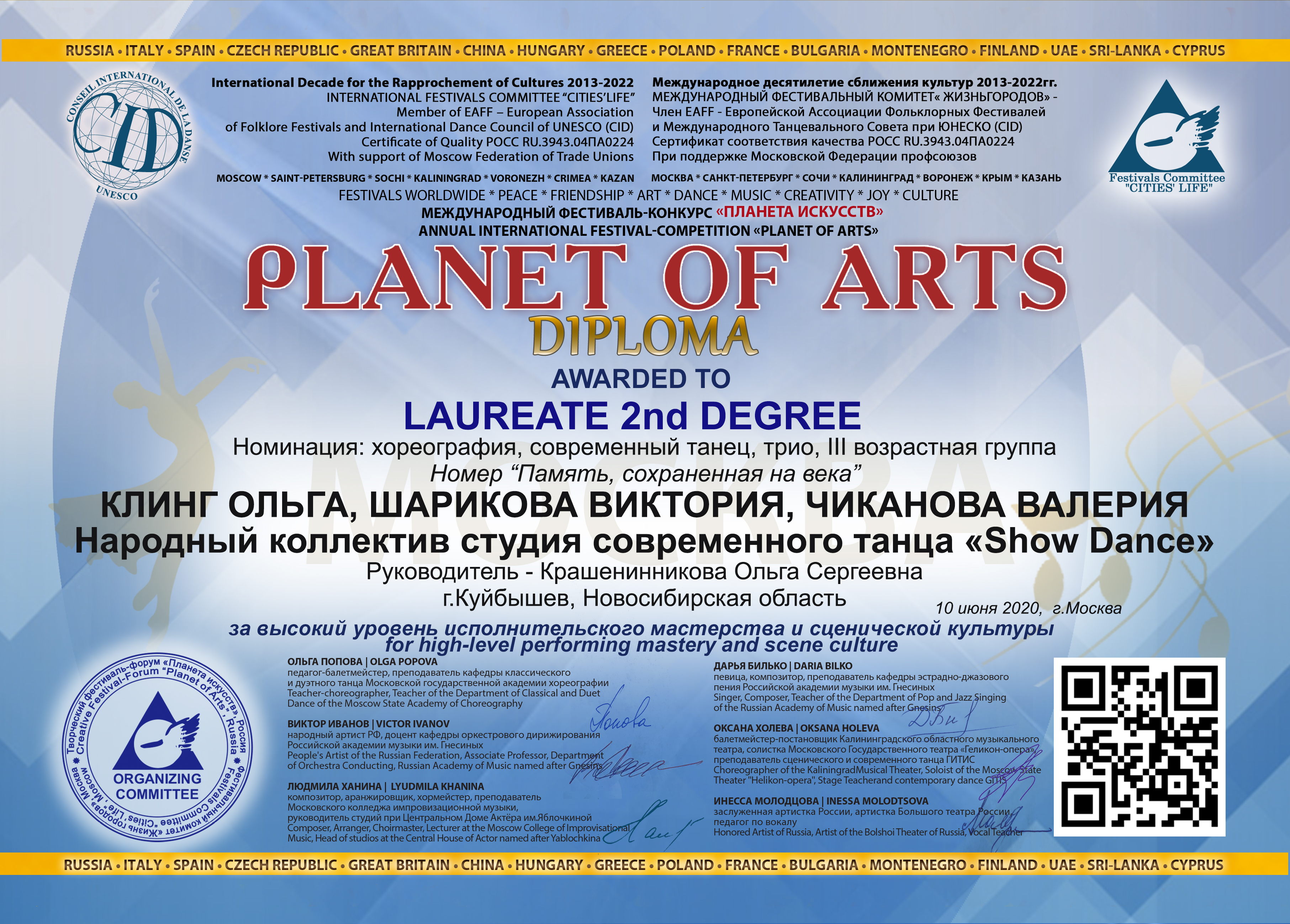 — Клинг Ольга, Шарикова Виктория, Чиканова Валерия в номинации «Хореография. Современный танец. Трио. III возрастная группа» за номер «Память, сохраненная на века» дипломом ЛАУРЕАТА II степени.