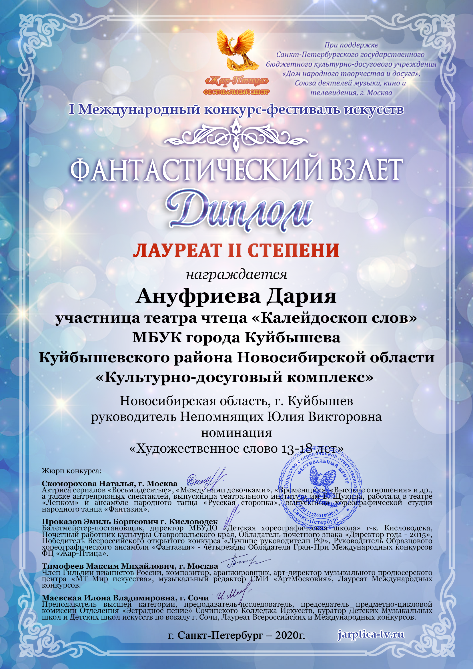 Ануфриева Дария и Тюрина Алина — юные участницы Театра чтеца «Калейдоскоп слов» (руководитель Ю.В. Непомнящих) МБУК «Культурно-досуговый комплекс» г. Куйбышева стали Лауреатами II степени I Международного конкурса- фестиваля искусств «Фантастический взлет».
