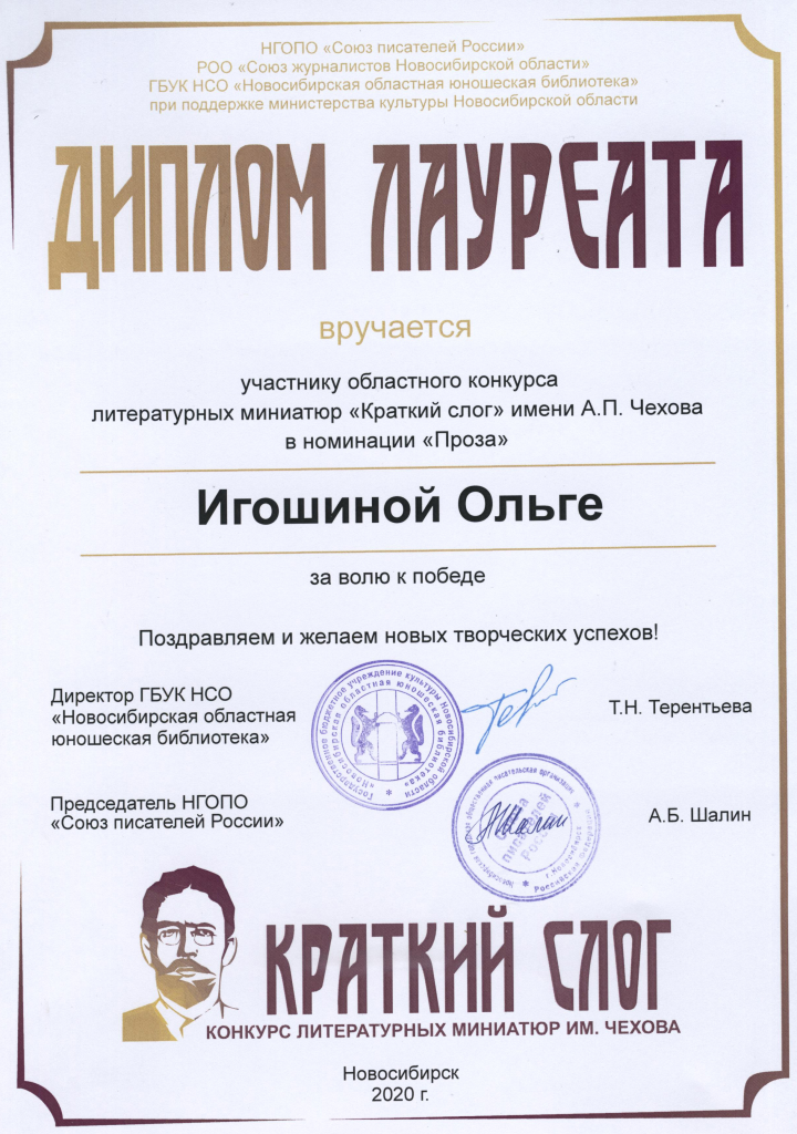 — Областной конкурс литературных миниатюр «Краткий слог», посвященный А.П. Чехову, г.Новосибирск.