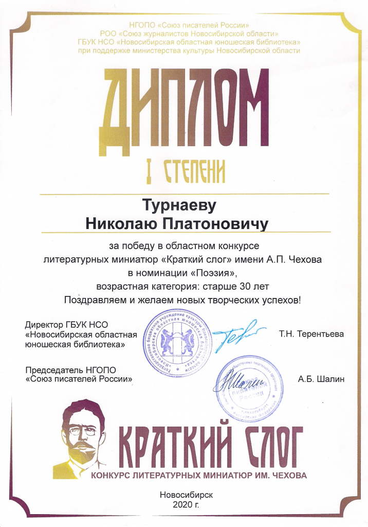 - Диплом I степени и подарочный сертификат — Турнаев Н.П. в номинации «Поэзия».