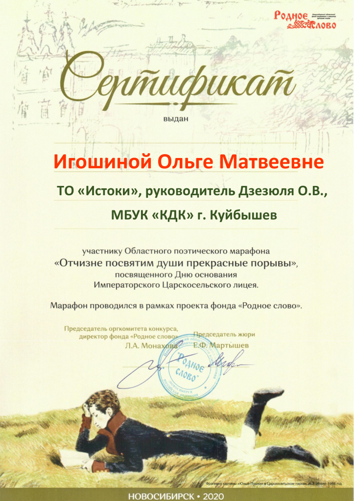 — Областной поэтический марафон «Отчизне посвятим прекрасные порывы», посвящённый Дню основания Императорского Царскосельского лицея. Марафон в рамках проекта фонда «Родное слово». Сертификат Игошиной О.М.