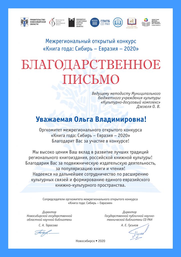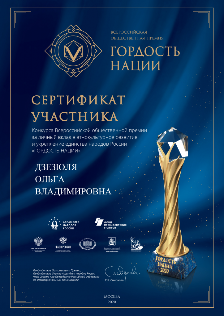 — Конкурс Всероссийской общественной премии за личный вклад в этнокультурное развитие и укрепление единства народов России «Гордость нации». Ассамблея народов России, Фонд Президентских грантов, Совет при Президенте РФ по межнациональным отношениям, Федеральное агентство по делам национальностей России, Государственная Дума, Департамент национальной политики и межрегиональных связей города Москвы, Общественная палата Российской Федерации. Духовно-нравственно-просветительский Проект «Открытый литературно-музыкальный Рождественский конкурс – фестиваль «Рождество Христово», руководитель проекта Дзезюля О.В. Сертификат.