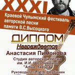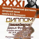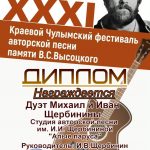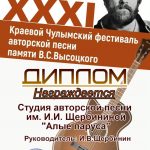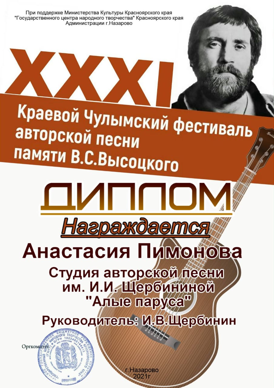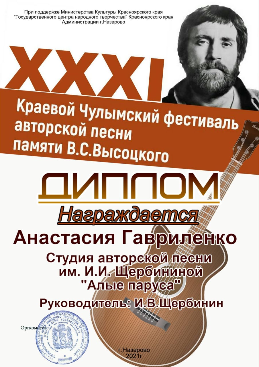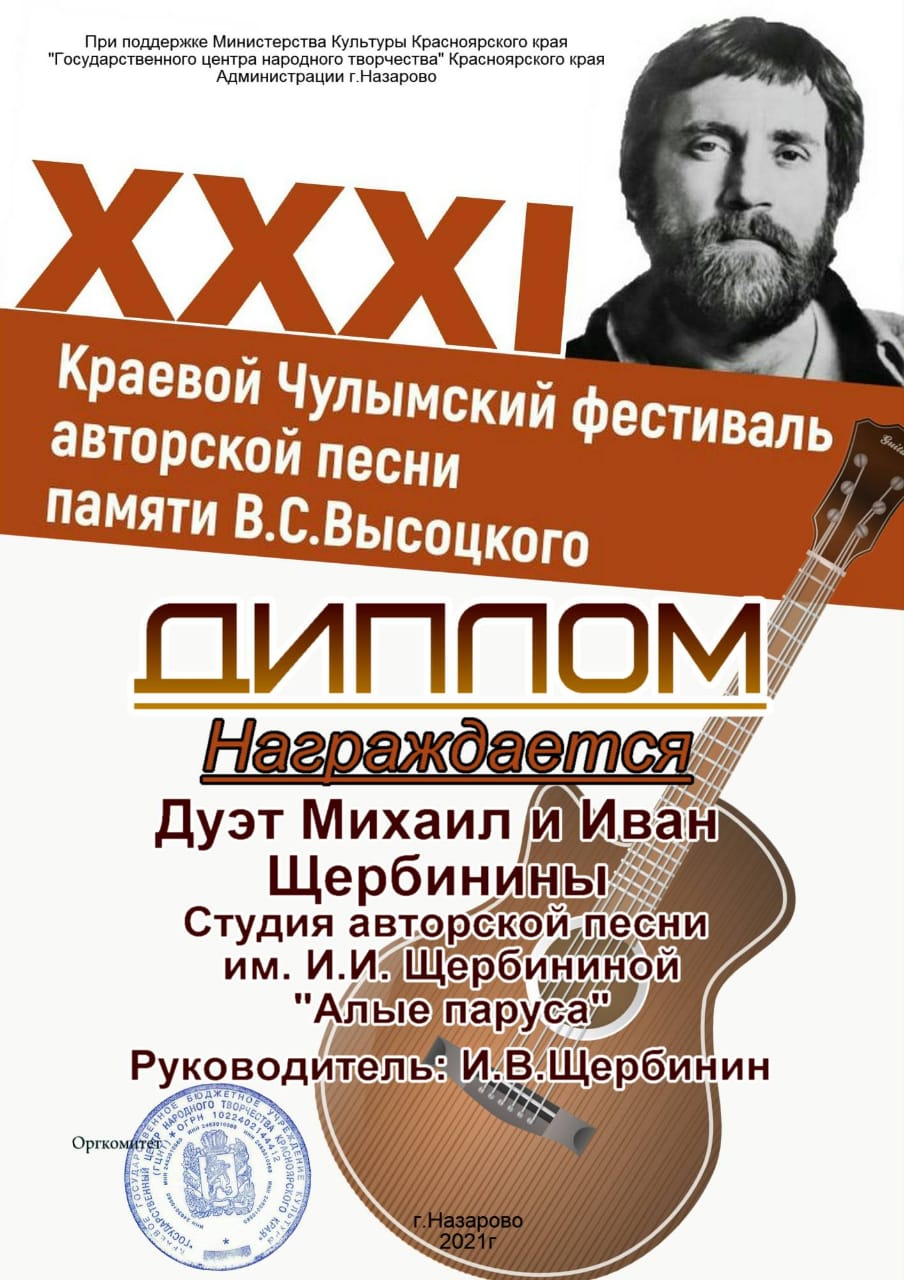 25 января на сайте КДЦ города Назарово был представлен большой видео- концерт в рамках XXXI Краевого Чулымского фестиваля авторской песни памяти В.С. Высоцкого, в котором приняли активное участие исполнители образцового коллектива студии авторской песни имени И.И. Щербининой «Алые паруса» МБУК «КДК» города Куйбышева. Все куйбышевские участники (САП «Алые паруса», дуэт Милена Яблокова и Александра Тюленева», Анастасия Пимонова, Анастасия Гавриленко, дуэт Михаил и Иван Щербинины, Дарья Функнер, Милена Яблокова) стали Дипломантами очередного фестиваля имени В.С. Высоцкого в г.Назарово.