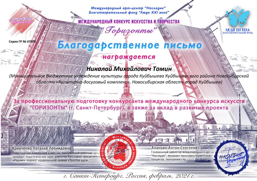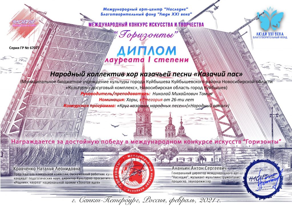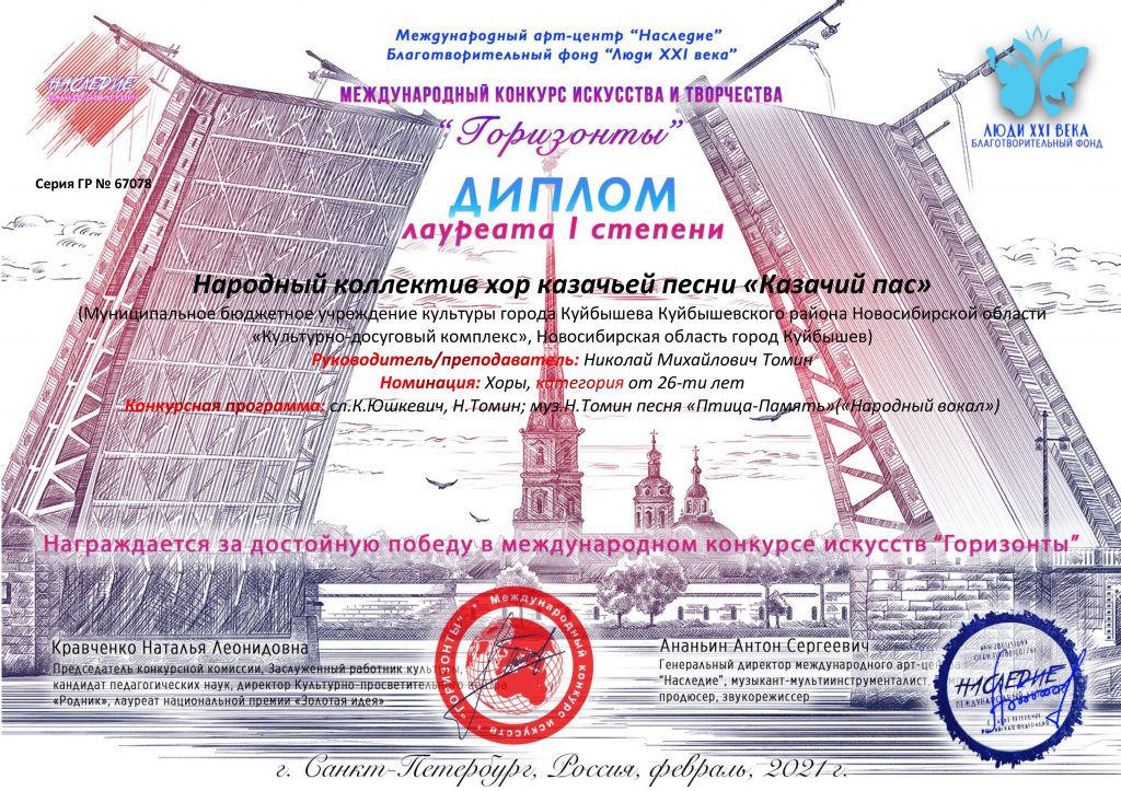 В феврале 2021г. в г. Санкт — Петербург подведены итоги Международного конкурса-фестиваля «ГОРИЗОНТЫ», учредителями и организаторами которого являются Международный арт-центр «Наследие» и Благотворительный фонд «Люди XXI века».