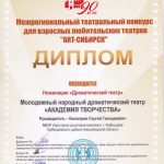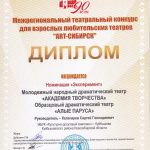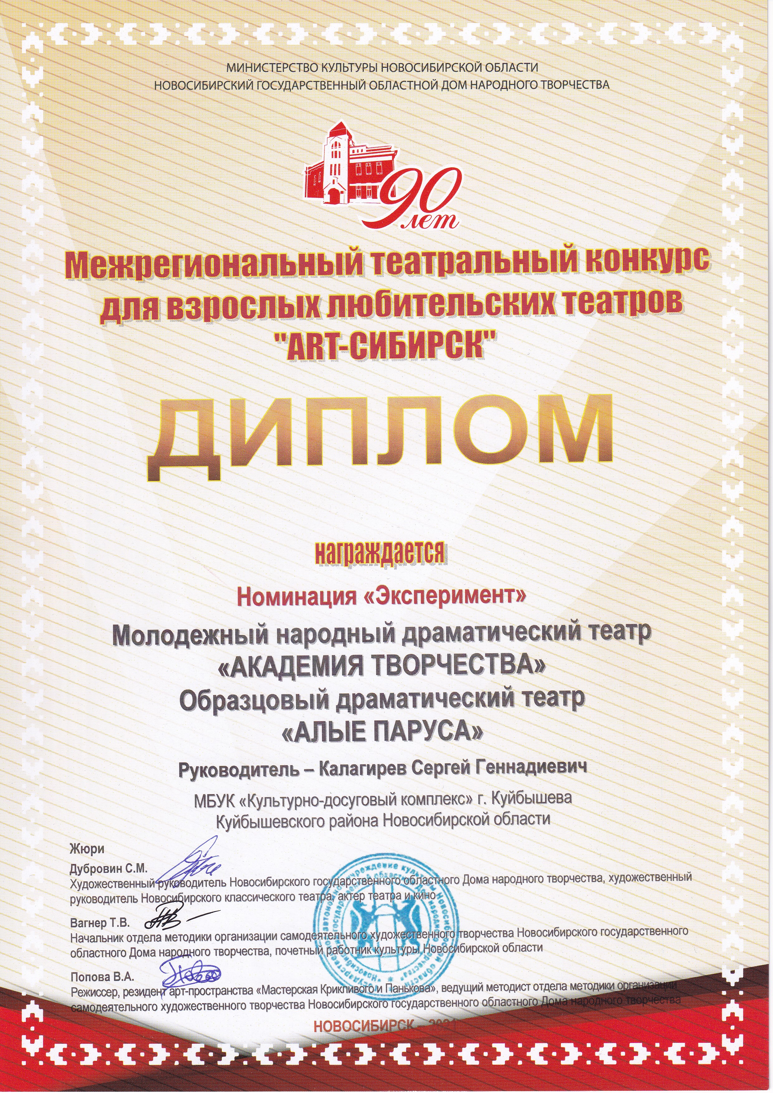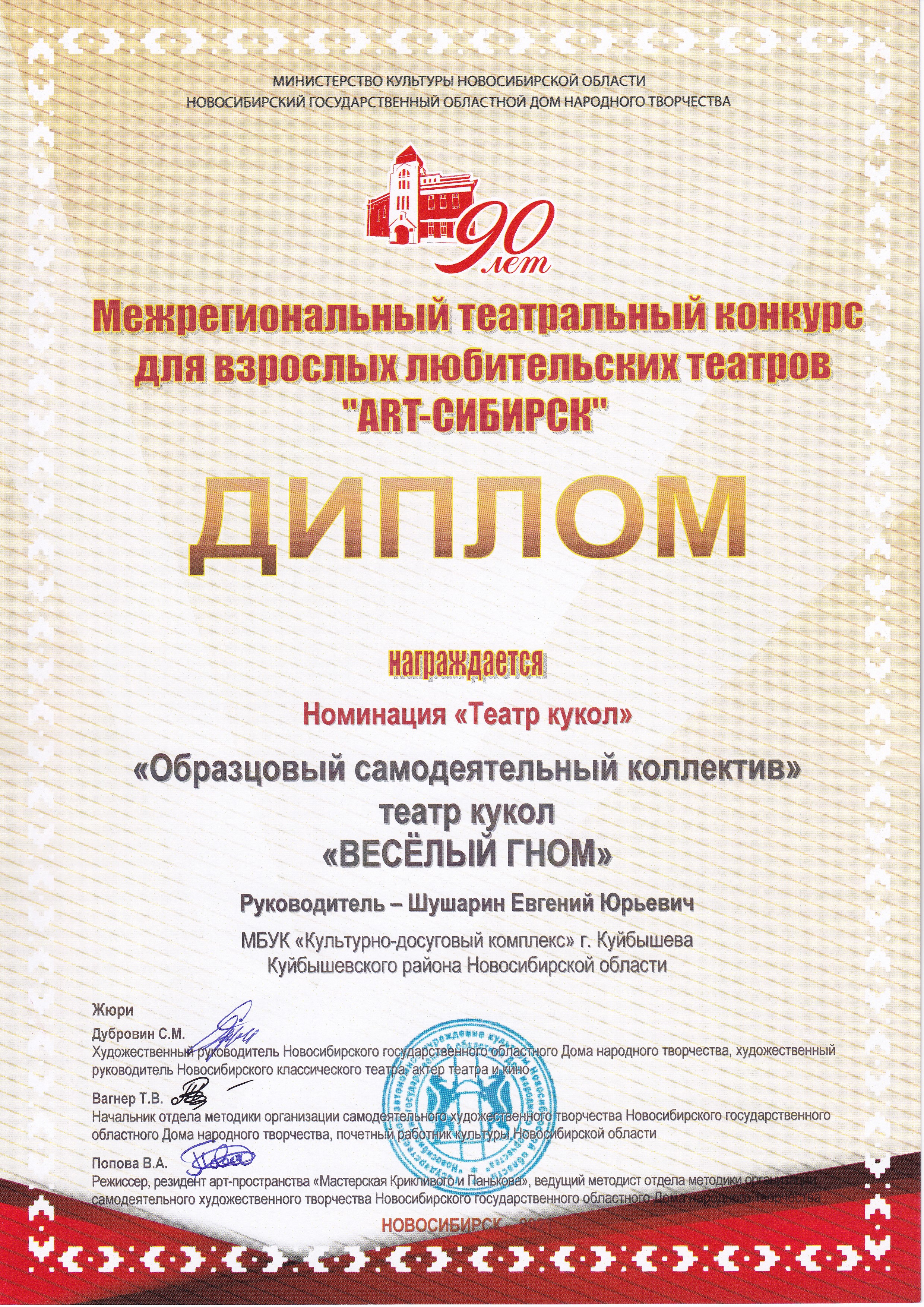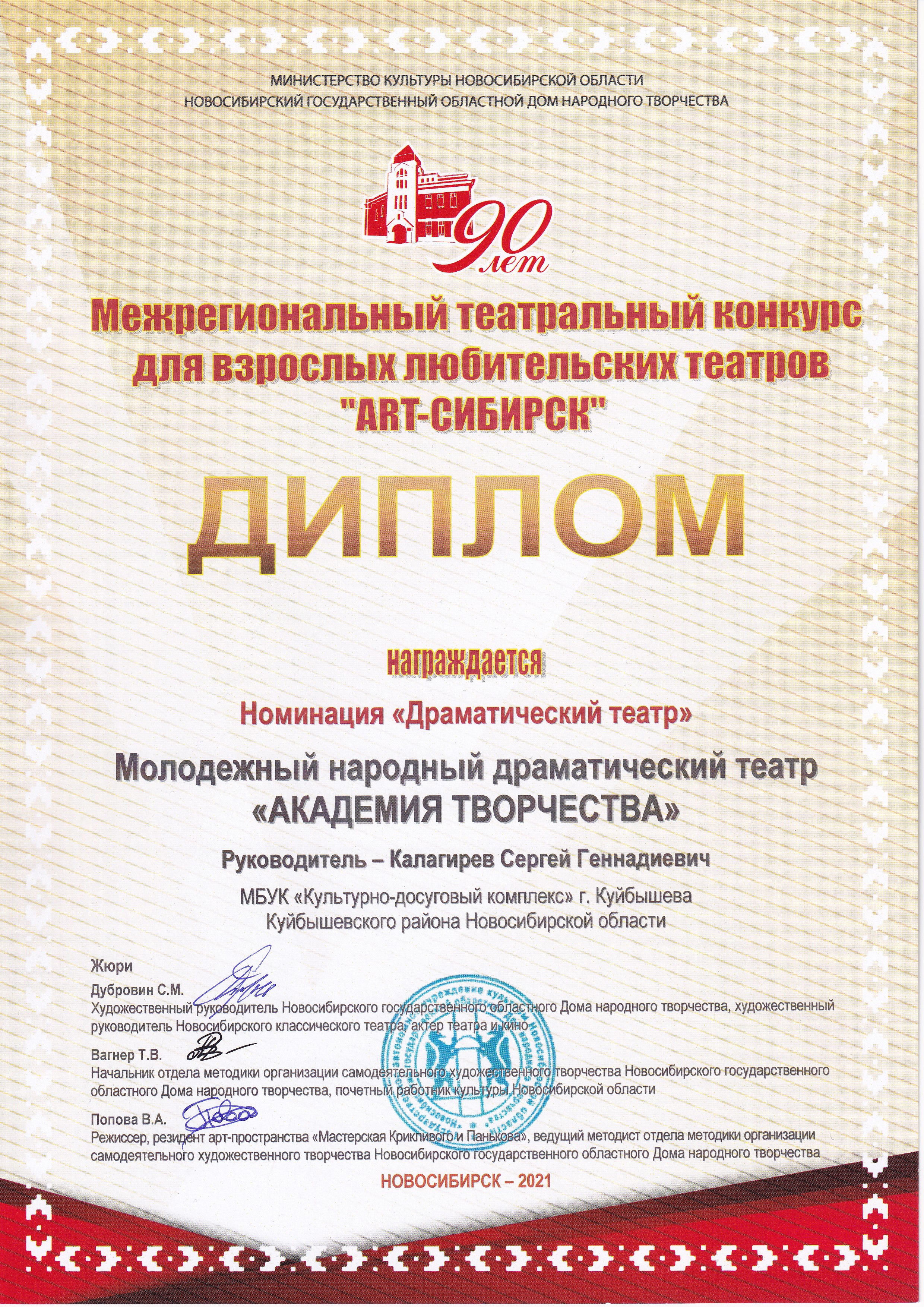 МБУК «КДК» г. Куйбышева на I зональном просмотре Межрегионального театрального конкурса для взрослых любительских театральных коллективов «ART-СИБИРСК» представили следующие театральные коллективы: Молодежный народный драматический театра «Академия творчества» и Образцовый драматический театр (режиссер Калагирев С.Г.), Образцовый самодеятельный коллектив театр кукол «Веселый Гном» (режиссер- Шушарин Е.Ю.).