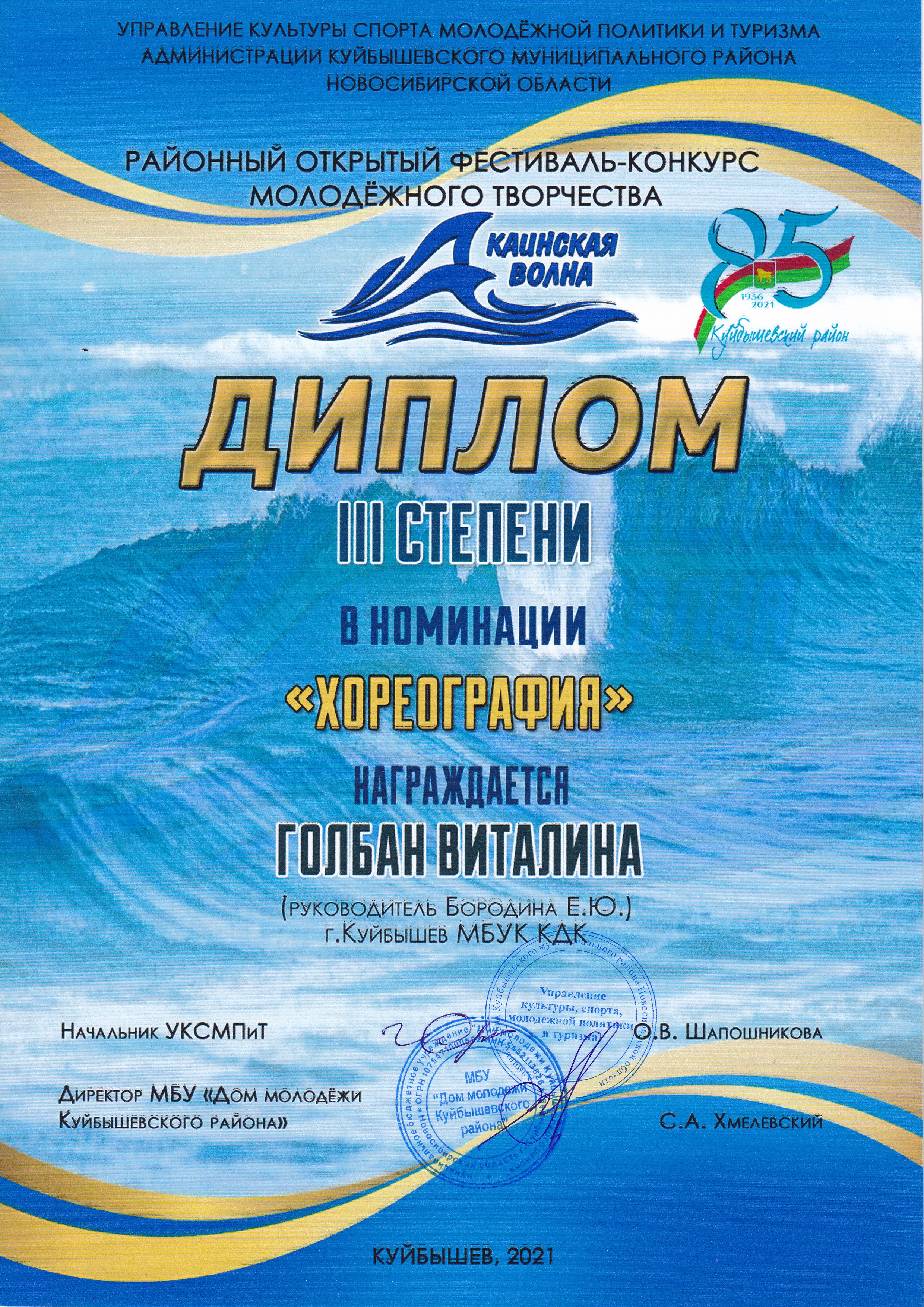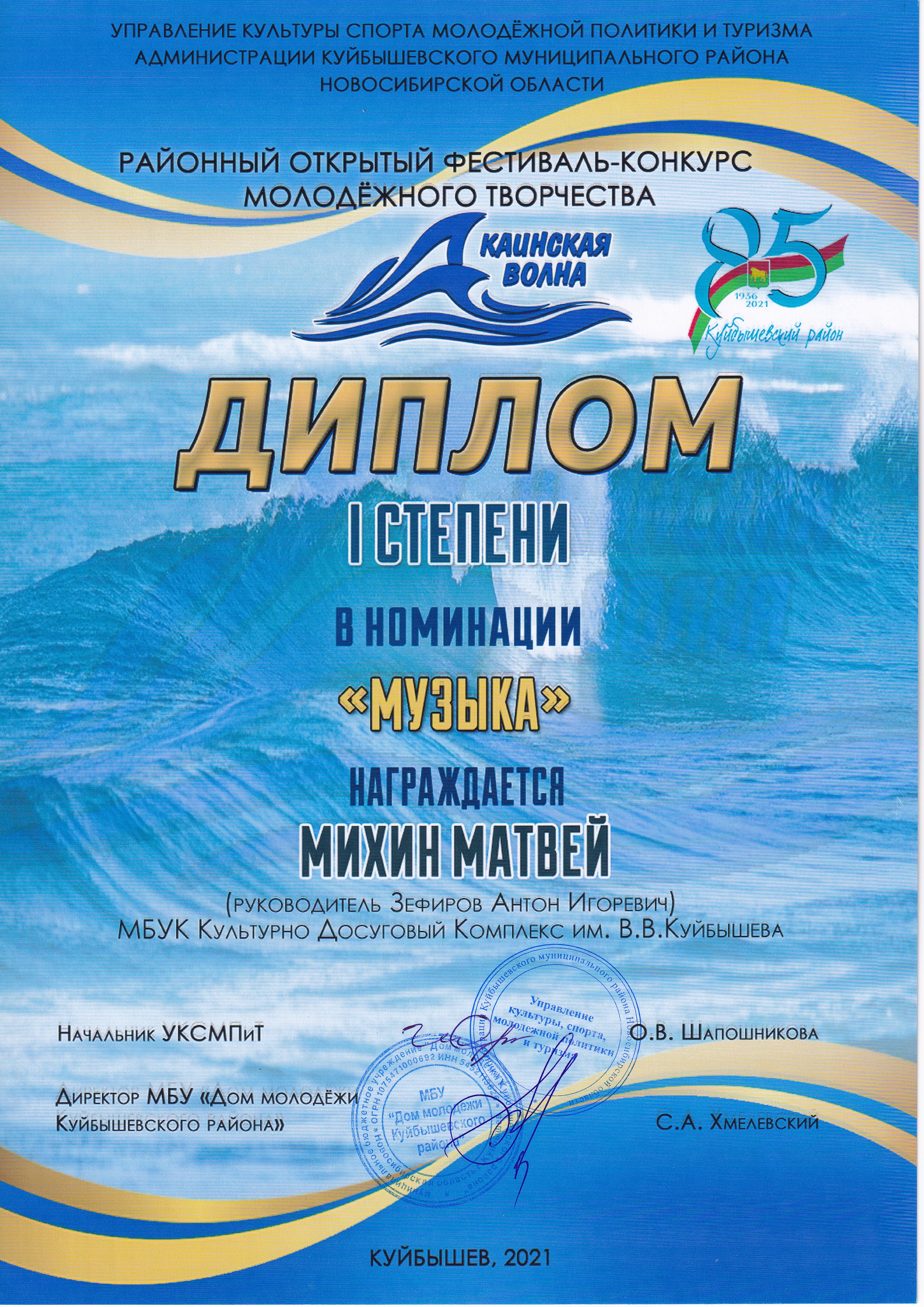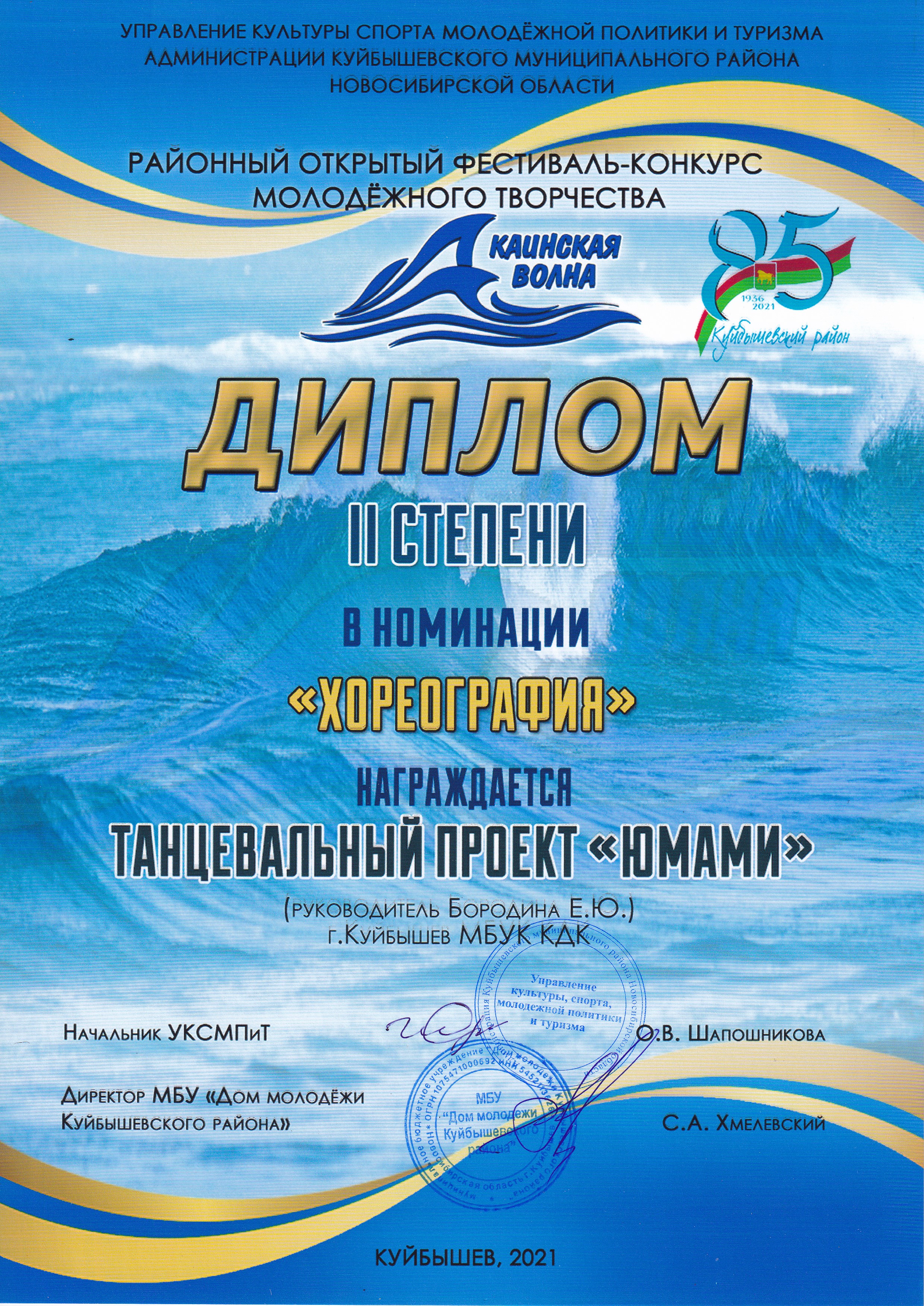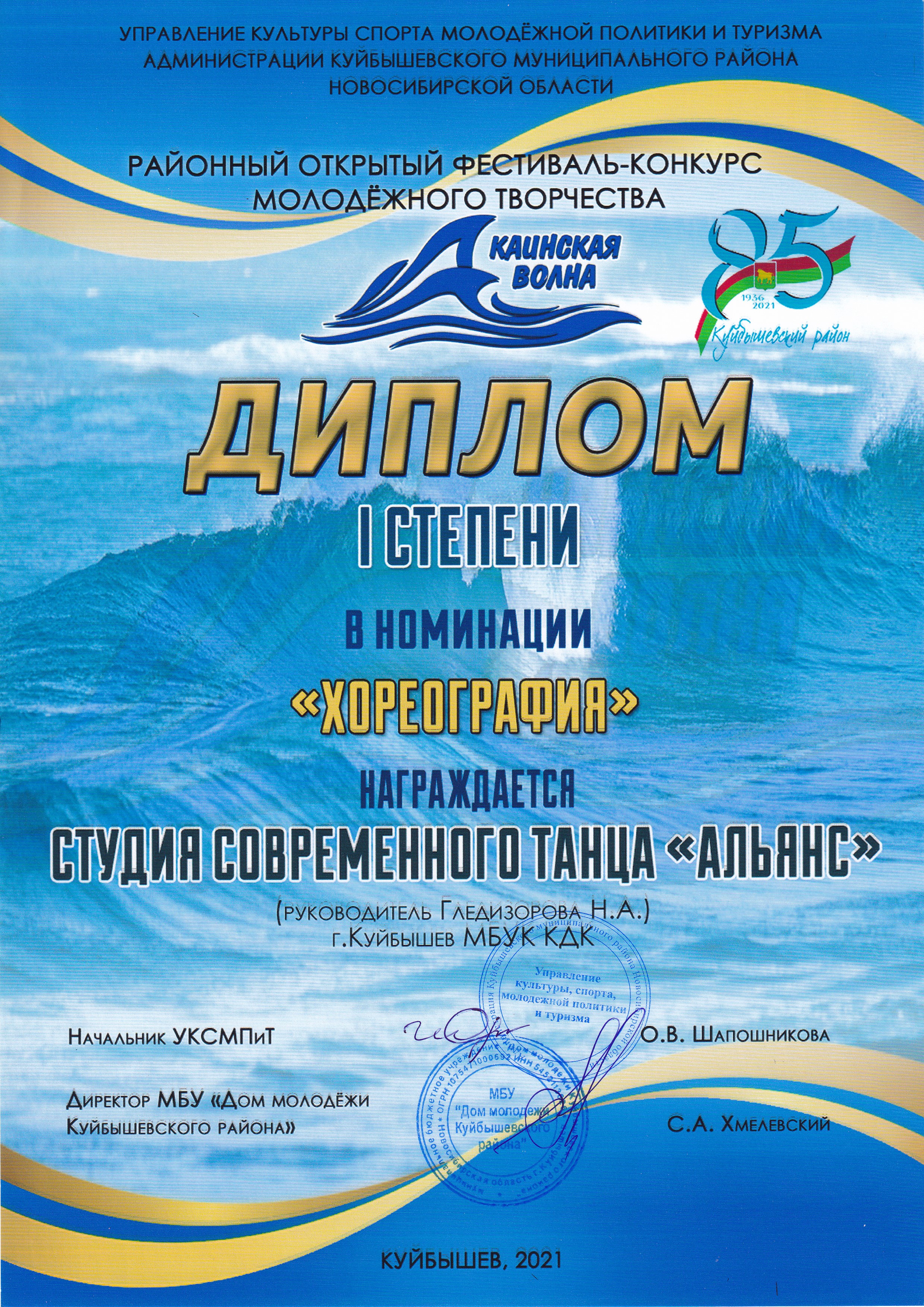 Творческие коллективы МБУК «Культурно-досуговый комплекс» г. Куйбышева приняли в фестивале активное участие: в номинации «хореография» Студия современного танца «Альянс» (балетмейстер Н.А. Гледизорова) была удостоена ДИПЛОМА I степени и танцевальный проект «ЮМАМИ» (балетмейстер Е.Ю. Бородина) ДИПЛОМА II степени, солистка танцевального проекта «ЮМАМИ» Виталина Голбан заняла почётное III место, в номинации «музыка» ДИПЛОМА I степени удостоен солист образцового коллектива Духовой оркестр Матвей Михин (дирижер А.И. Зефиров). Поздравляем участников фестиваля с достойными наградами и желаем дальнейших творческих успехов и достижений!