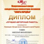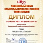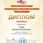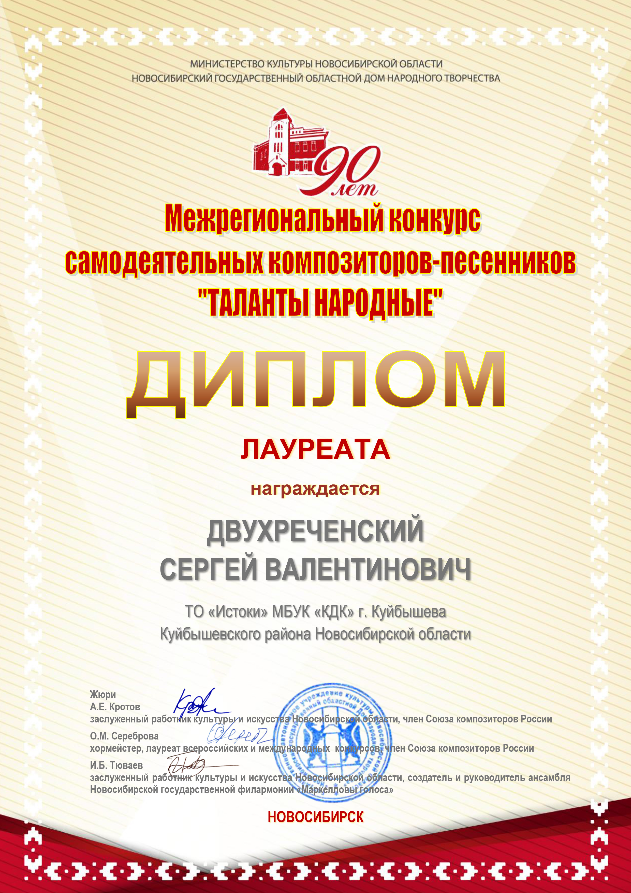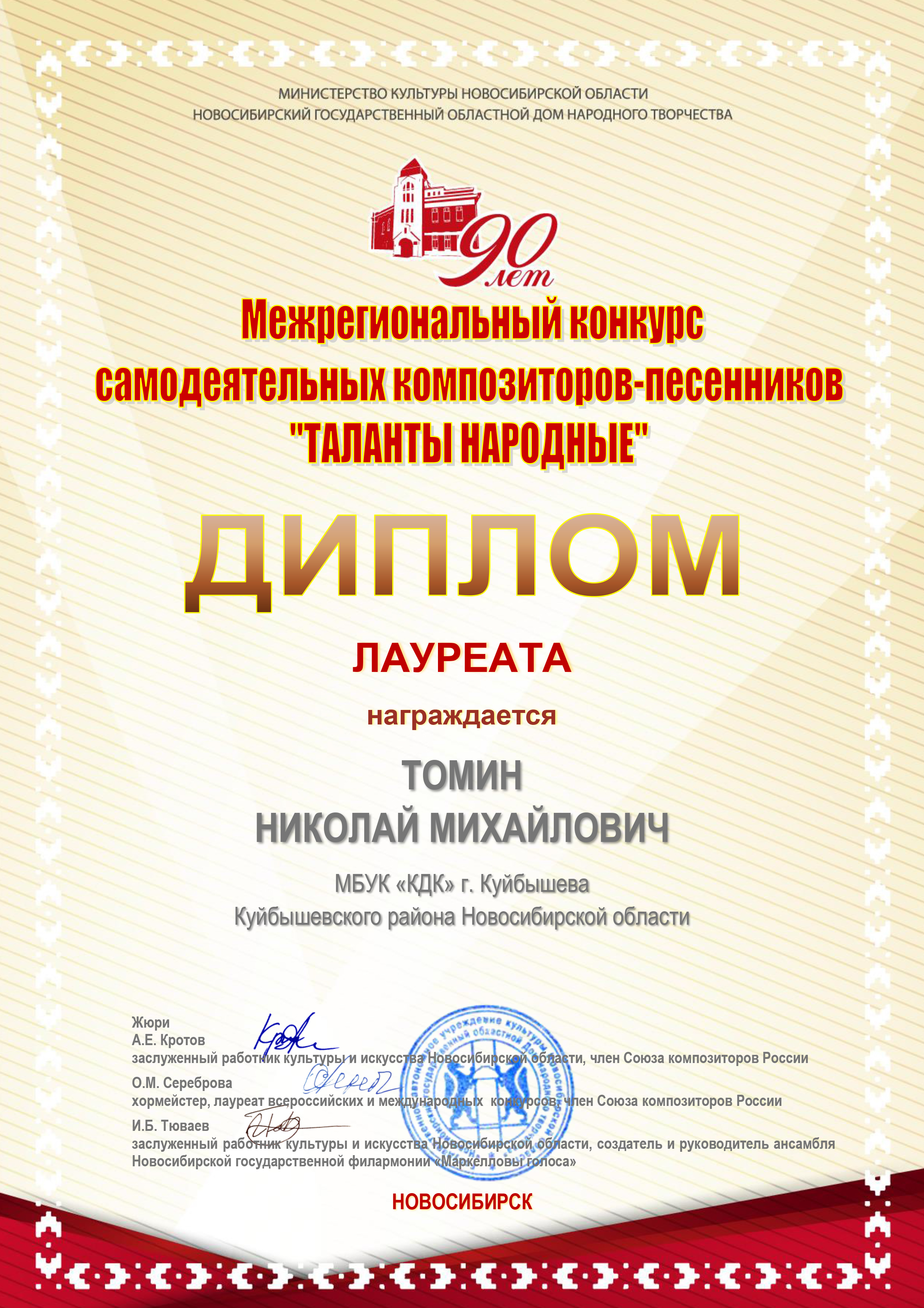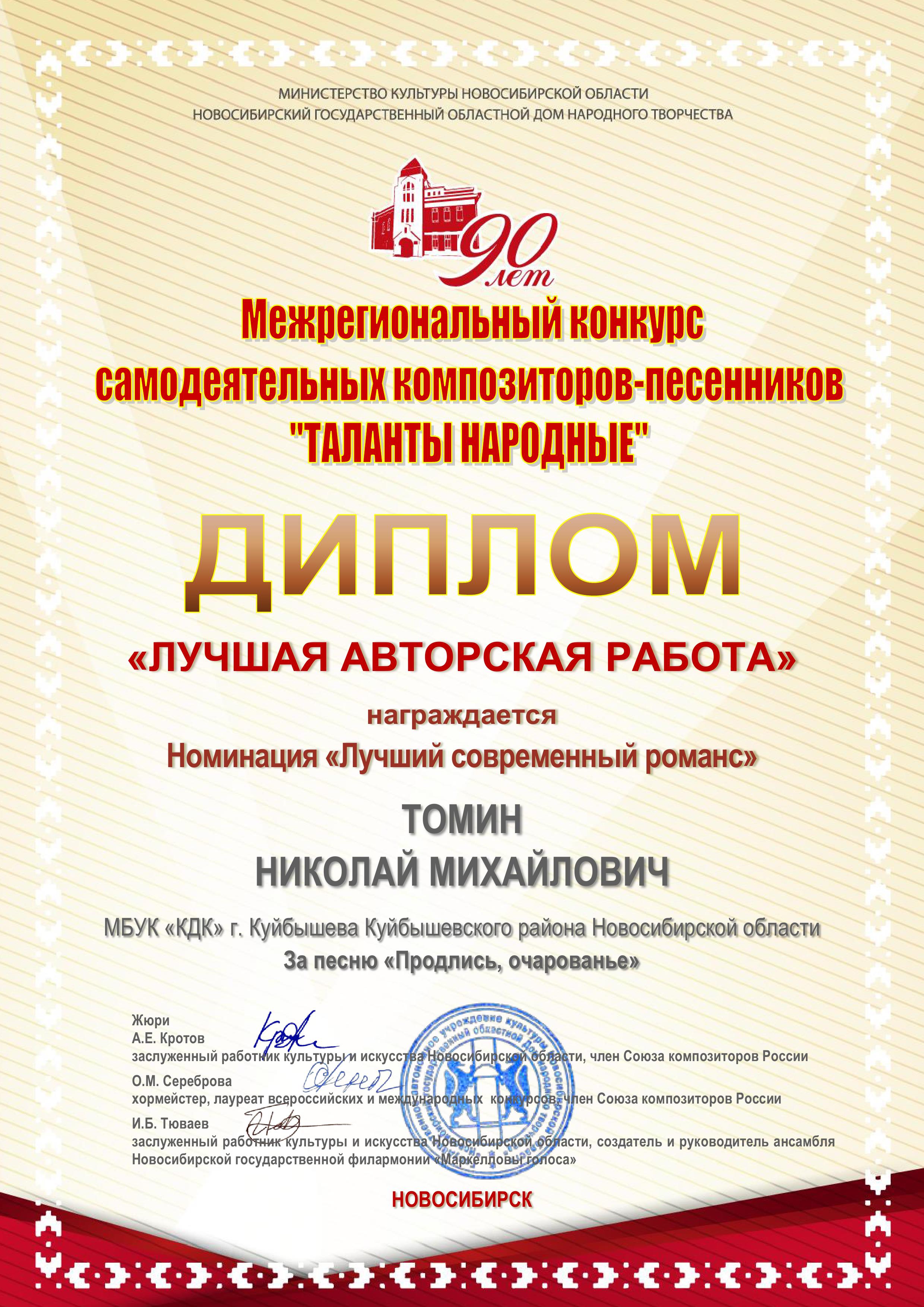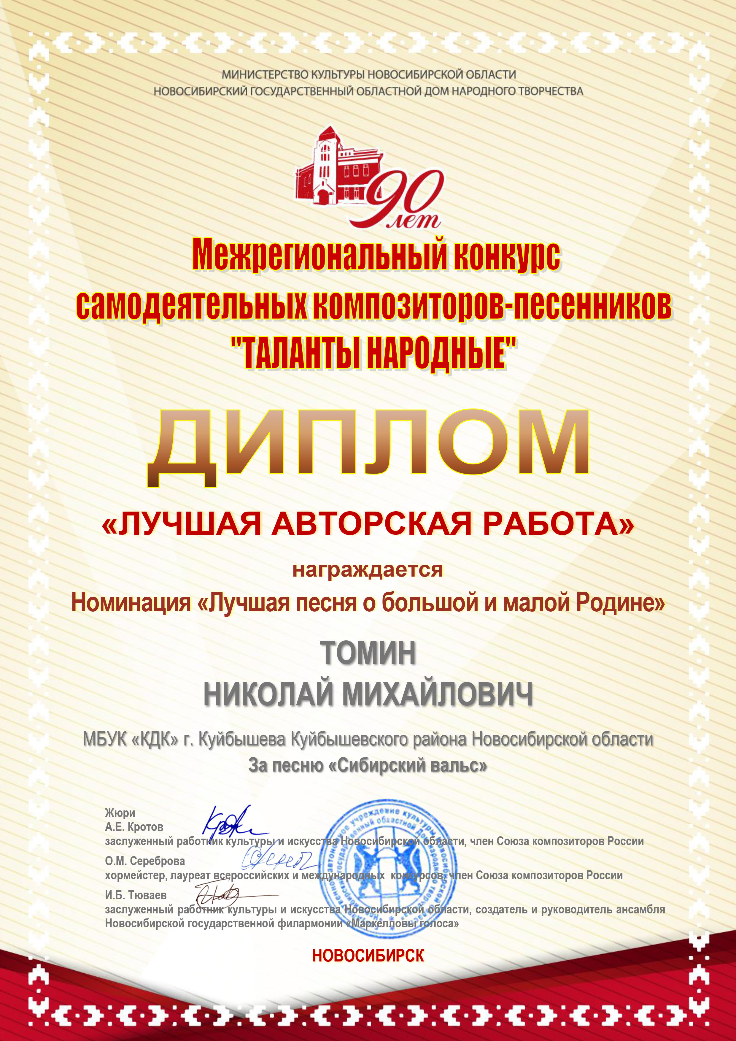 Определены лауреаты и дипломанты конкурса. Присуждены дипломы «За лучшую авторскую работу» в 9 номинациях и специальные дипломы. Творческие работы – победители войдут в сборник композиторов-любителей г. Новосибирска и Новосибирской области. От МБУК «КДК» города Куйбышева лауреатами конкурса стали Николай Михайлович Томин и Сергей Валентинович Двухреченский (ТО «Истоки»). Композитор Николай Михайлович Томин удостоен наивысших наград конкурса: «Лучшая авторская работа» в номинации «Лучшая песня о большой и малой Родине» за песню «Сибирский вальс» и «Лучшая авторская работа» в номинации «Лучший современный романс» за песню «Продлись, очарованье».