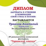 Лауреат 2 степени — Троянов Анатолий (номинация «Видеопоэзия»);