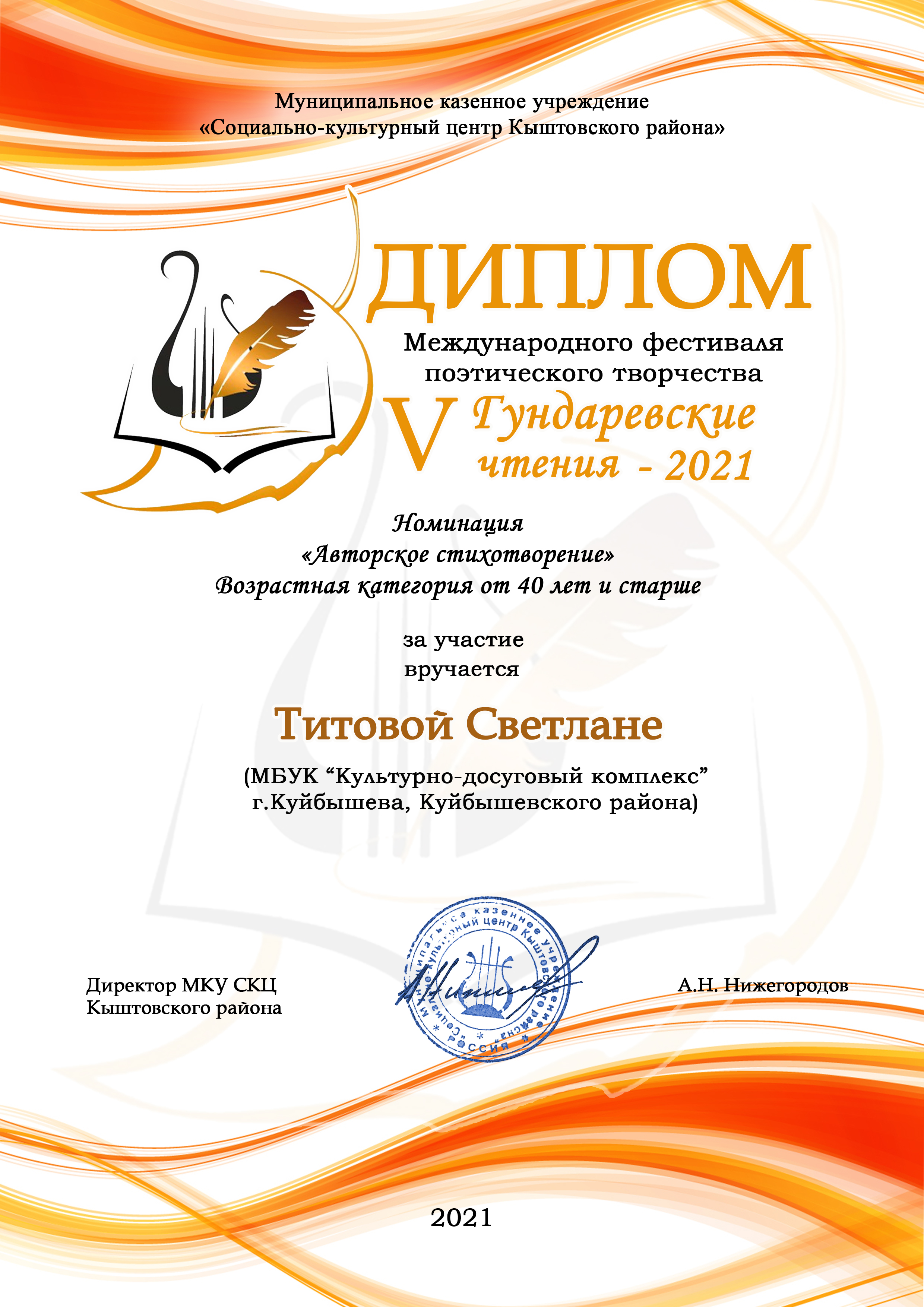 25 августа 2021 года состоялся V Международный музыкально-поэтический фестиваль «Гундаревские чтения–2021. Русский сын казахского народа», посвященный памяти знаменитого поэта – земляка В.Р. Гундарева. Учредителем и организаторами фестиваля являлись Муниципальное казенное учреждение «Социально – культурный центр Кыштовского района», Кыштовский Районный Дом культуры, районный методический центр. Фестиваль состоялся в двух форматах: очном и заочном(по видео). Более 70 участников в возрасте от 7 до 84 лет, в пяти номинациях из Кыштовского, Сузунского, Куйбышевского, Чистоозерного, Тогучинского районов, г. Степногорск (Казахстан) читали стихи поэта, авторские стихи, исполняли песни на стихи Владимира Романовича. Город Куйбышев на фестивале представили участники ТО «Истоки» (руководитель Дзезюля О.В.) МБУК «Культурно-досуговый комплекс». В номинации «Авторское стихотворение» конкурсные работы наших земляков были удостоены следующими наградами: