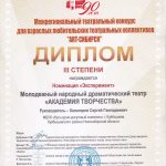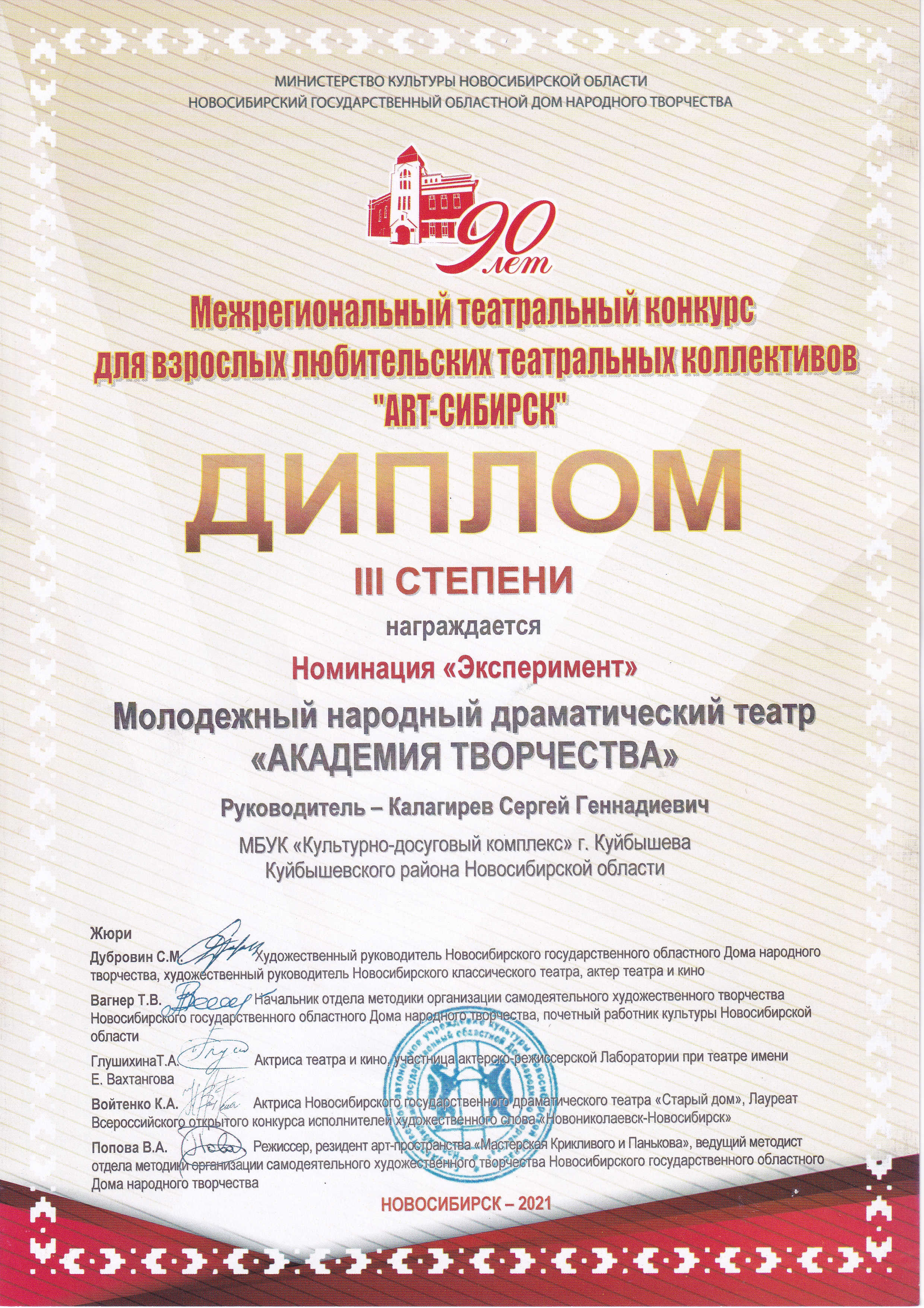 Молодежный народный драматический театр «Академия творчества», режиссер С.Г.Калагирев МБУК «Культурно- досуговый комплекс» города Кубышева был удостоен ДИПЛОМА III степени в номинации «ЭКСПЕРИМЕНТ».