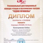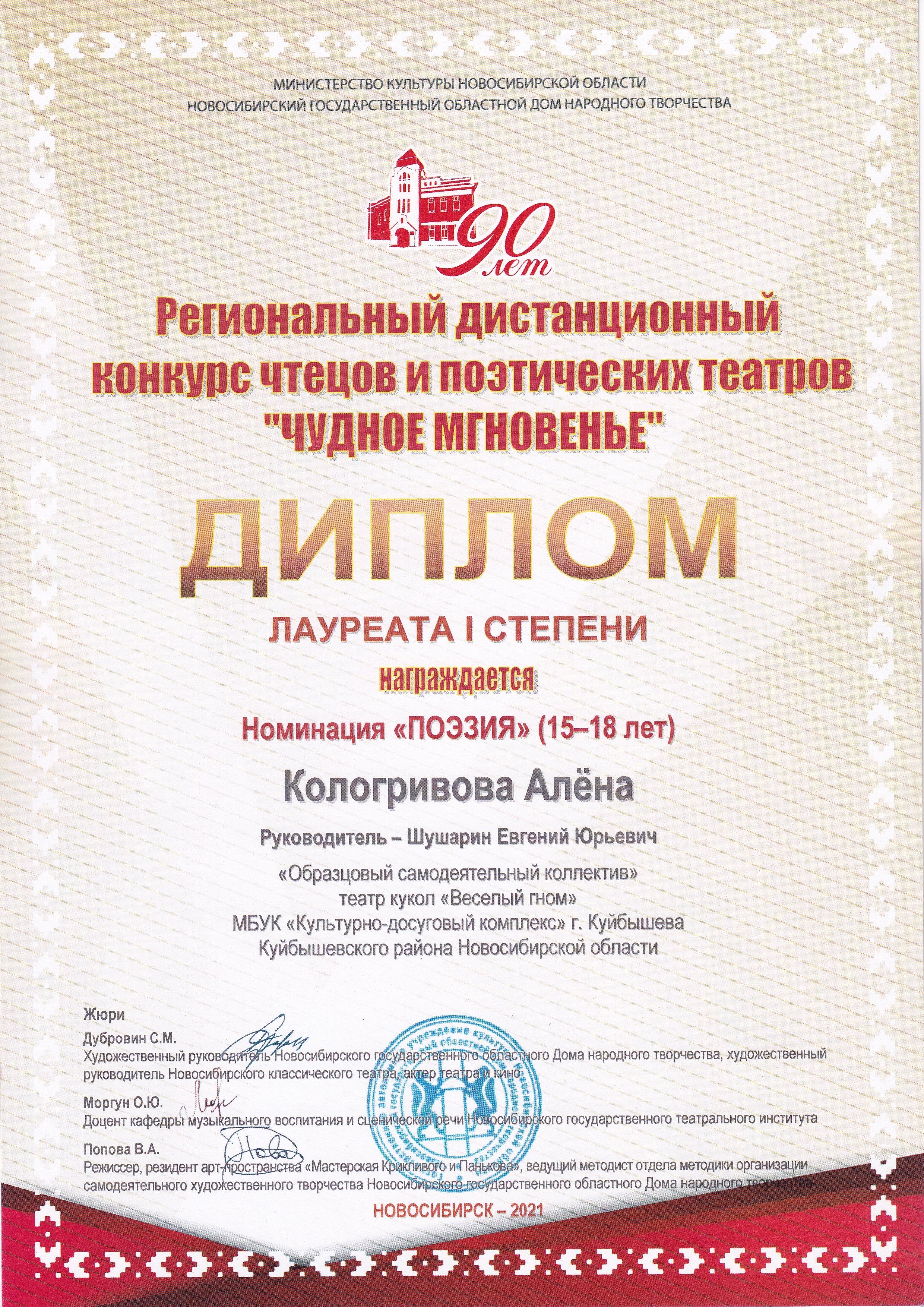 От МБУК «Культурно- досуговый комплекс» города Куйбышева диплома ЛАУРЕАТА I степени в номинации «ПОЭЗИЯ» удостоена Кологривова Алена («Образцовый самодеятельный коллектив» театр кукол «Веселый гном», режиссер Е.Ю.Шушарин).