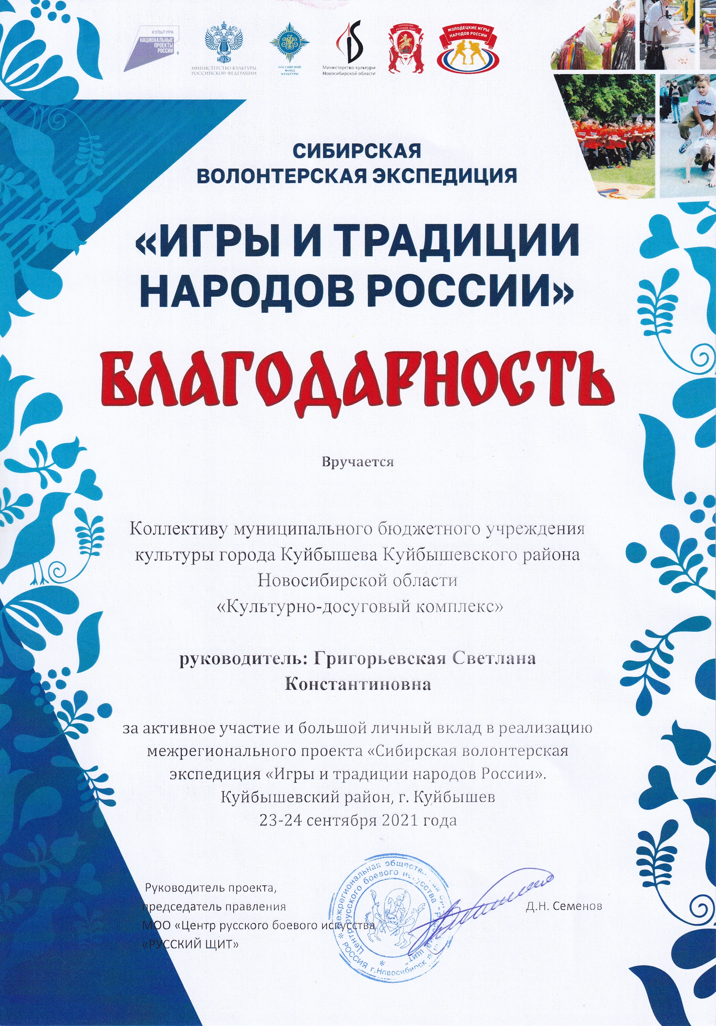 За активное участие и большой личный вклад в реализацию межрегионального проекта «Сибирская волонтерская экспедиция «Игры и традиции народов России» на территории города Куйбышева Куйбышевского района коллектив муниципального бюджетного учреждения культуры «Культурно- досуговый комплекс» был удостоен Благодарности руководителя проекта, председателя правления МОО «Центр русского боевого искусства «Русский щит» Д.Н. Семенова.