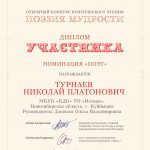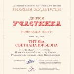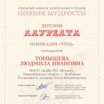 Городскую культуру представляли участники Творческого Объединения «Истоки», руководитель О.В.Дзезюля. Видеопрограммы чтения поэзии были предоставлены компетентному жюри на разные темы. В результате Дипломантами в номинации «Поэт» стали: Турнаев Н.П., Бойко Е.У., Титова С.Ю., Троянов А.В., Лауреат — Игошина О.М. Дипломанты в номинации «Чтец» — Калинина И.А., Лауреат – Тонышева Л.И.