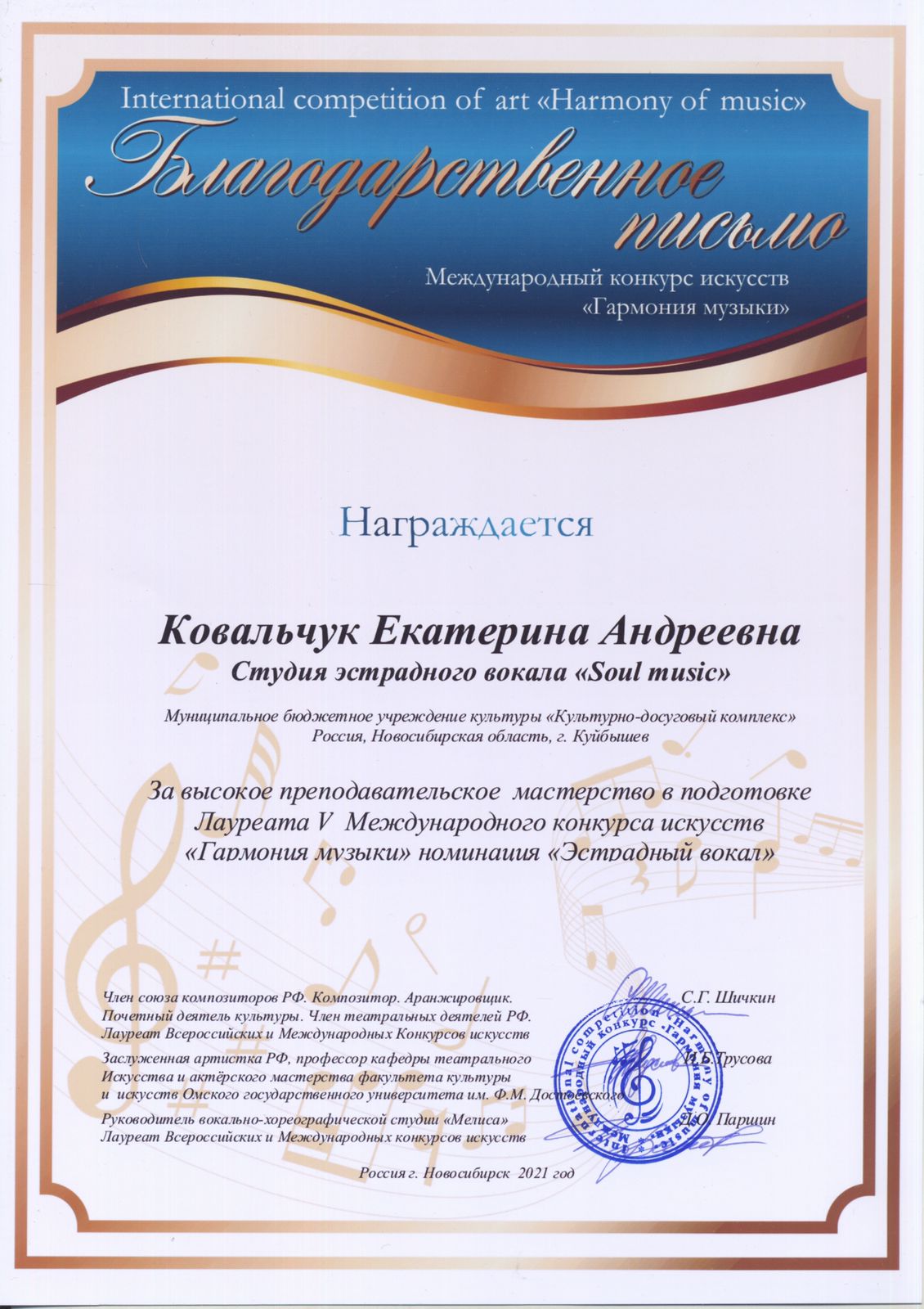 С 18 октября по 07 ноября 2021 в г. Новосибирске Дирекция Международного центра развития и поддержки национальной культуры, при содействии методического объединения фестивальных и культурных программ проводила V Международный конкурс искусств «Гармония музыки» в заочном формате (по видеозаписям).