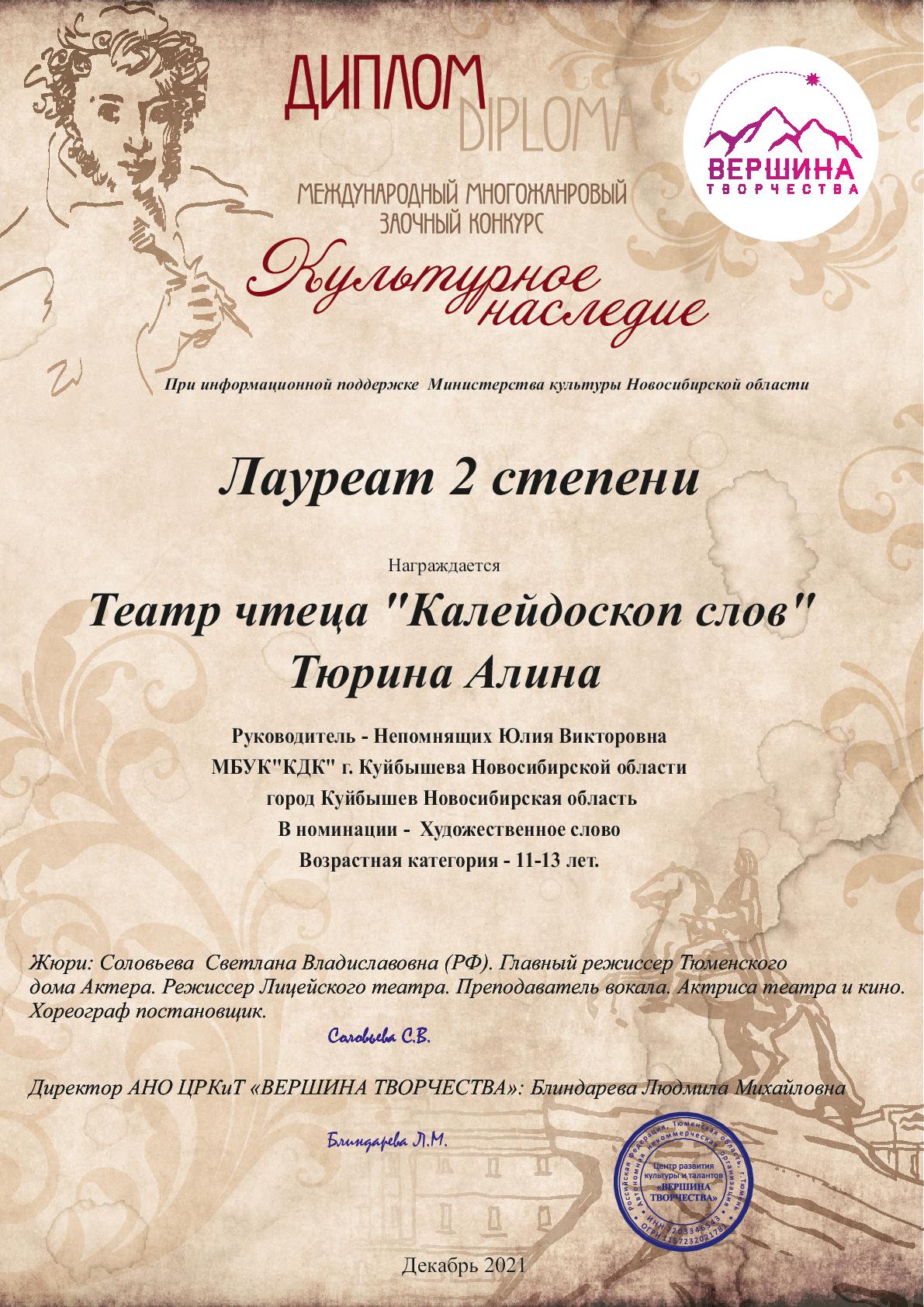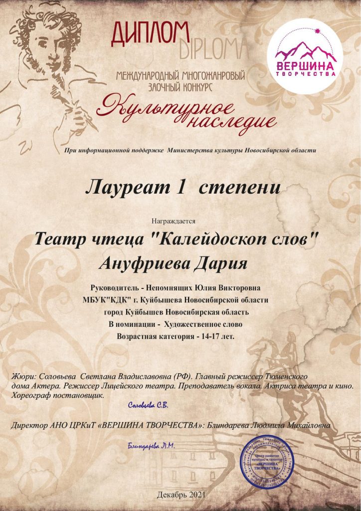 Наконец-то стали известны результаты участия театра чтеца «Калейдоскоп слов» (руководитель Ю. В. Непомнящих) в VII Международном многожанровом конкурсе (заочном) «Культурное наследие».