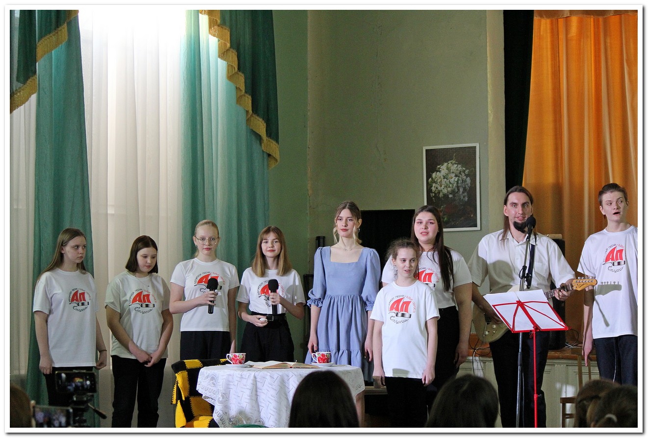 В завершении вечера на сцену вышли участники студии авторской песни «Алые паруса» (рук.И.В.Щербинин). Ребята спели несколько песен из своего репертуара, одной из которых была «Алданская» (автор Ирина Щербинина).