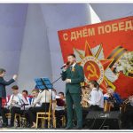 Идущих горожан на возложение цветов и венков к монументу «Воинской Славы» встречал маршами и песнями о войне Заслуженный коллектив народного творчества НСО Духовой оркестр им. Б.П. Уварова (дирижер А.В. Гончаров). В рядах бессмертного полка бок о бок стояли взрослые и дети.