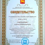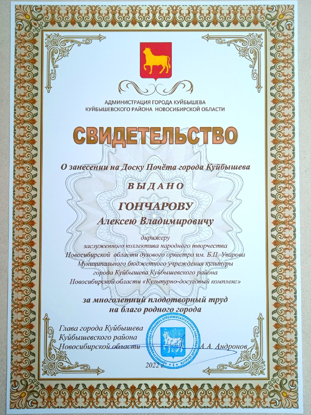 В День России ГОНЧАРОВУ АЛЕКСЕЮ ВЛАДИМИРОВИЧУ-дирижеру заслуженного коллектива народного творчества Новосибирской области им. Б.П. Уварова Муниципального бюджетного учреждения культуры города Куйбышева Куйбышевского района Новосибирской области «Культурно-досуговый комплекс» было вручено Свидетельство о занесении на Доску почета за многолетний плодотворный труд на благо родного города.