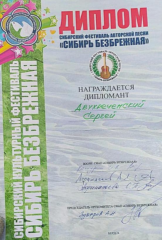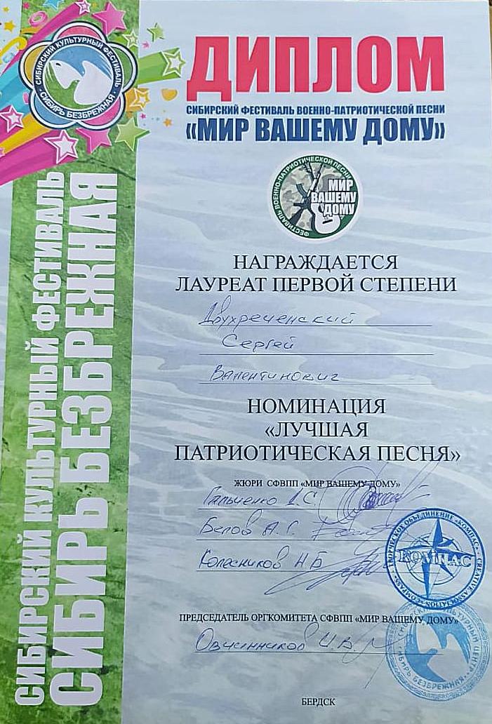 В начале июля 2022 года в г.Бердске в рамках Сибирского культурного фестиваля «Сибирь безбрежная» состоялся Сибирский фестиваль военно-патриотической песни «Мир вашему дому», на котором Сергей Двухреченский стал Лауреатом 1 степени в номинации «Лучшая патриотическая песня».
