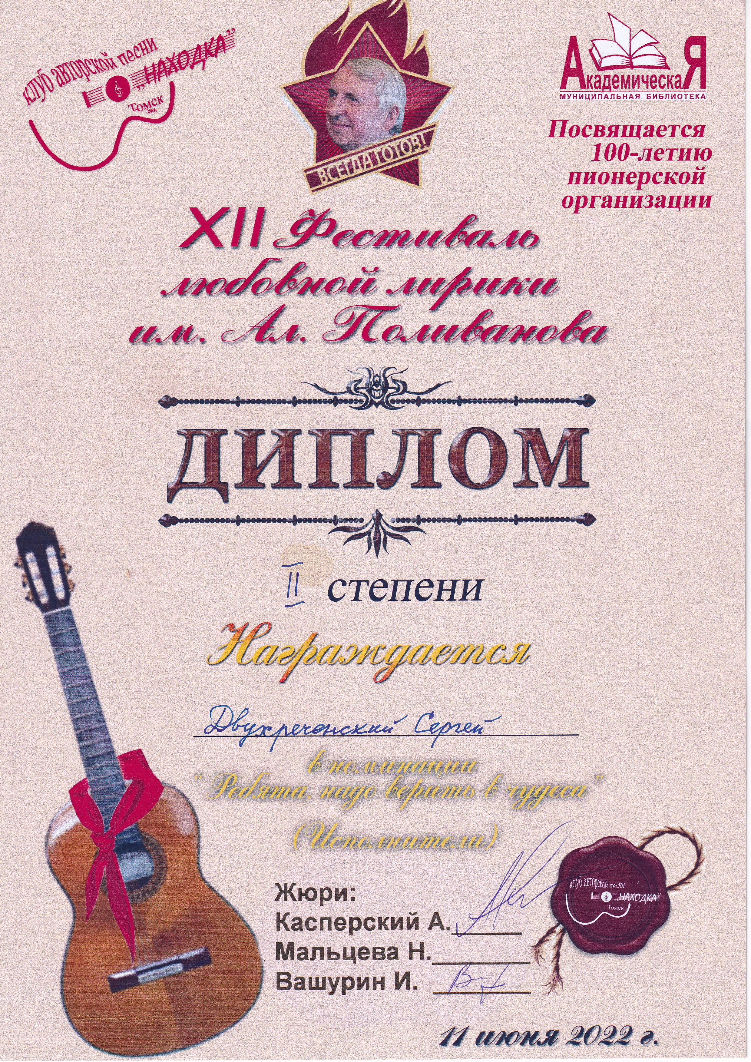 В июне 2022 года в г.Томск проходил XII Фестиваль любовной лирики им.Ал.Поливанова, в котором принял участие автор и исполнитель, участник ТО «Истоки» (рук. Дзезюля О.В.) С.В.Двухреченский, и стал обладателем Диплома II степени в номинации «Ребята, надо верить в чудеса!».