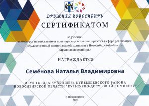 В номинации «лучшая практика среди подведомственных учреждений областных исполнительных органов государственной власти и органов местного самоуправления Новосибирской области» была представлена конкурсная работа «Городской фестиваль национальных культур «Куйбышев – единство непохожих» в рамках празднования Года народного искусства и нематериального культурного наследия народов России и 85-летия Новосибирской области». Итог конкурса — СЕРТИФИКАТ за участие.