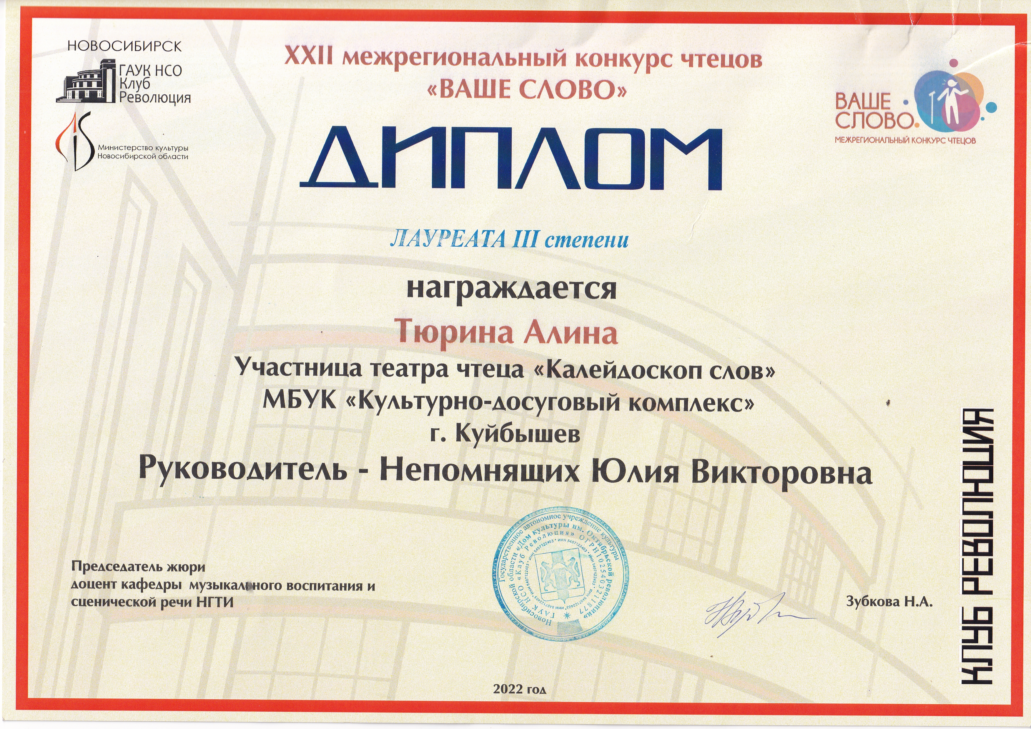 От МБУК «Культурно-досуговый комплекс» в конкурсе приняли участие юные актрисы театра чтеца «Калейдоскоп слов» МБУК «КДК» (руководитель Юлия Непомнящих) и показали достойные результаты. В жюри конкурса были преподаватели НГТИ и артисты Новосибирских театров, председатель – доцент кафедры музыкального воспитания и сценической речи НГТИ Н. А. Зубкова.
