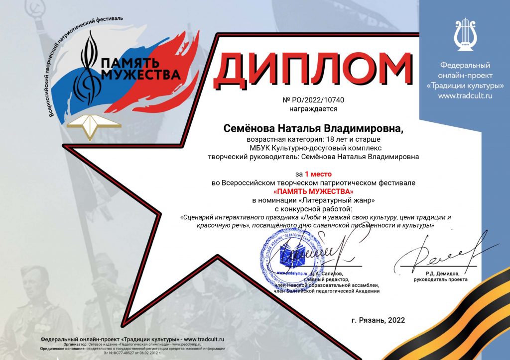 Дворец культуры на фестивале «Память мужества» представляла Н.В. Семёнова, ВРИО директора, в литературном жанре. Она представила на суд жюри (сформирован из членов редакции сетевого издания «Педагогическая олимпиада») сценарий интерактивного праздника «Люби и уважай свою культуру, цени традиции и красочную речь», посвящённого Дню славянской письменности и культуры, который занял 1 место.