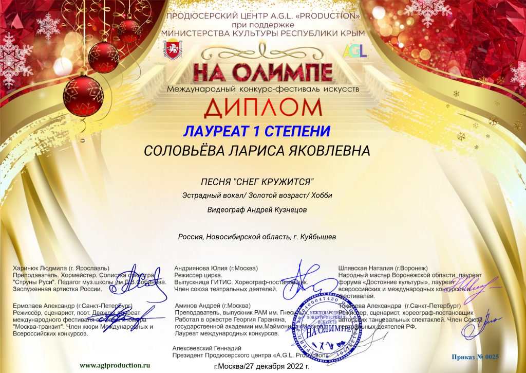 На суд жюри солистка ДК им.В.В. Куйбышева Лариса Соловьёва представила замечательную музыкальную композицию «Снег кружится», видеографом которой является А. Кузнецов. За исполнение песни Лариса Яковлевна удостоена диплома Лауреата 1 степени.