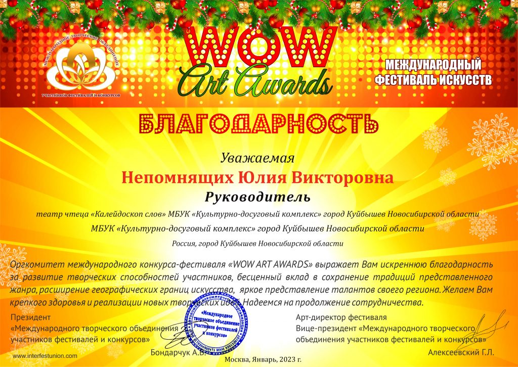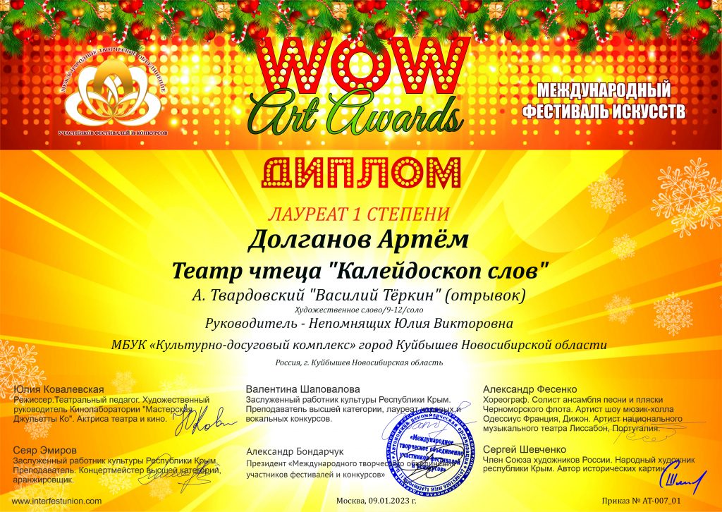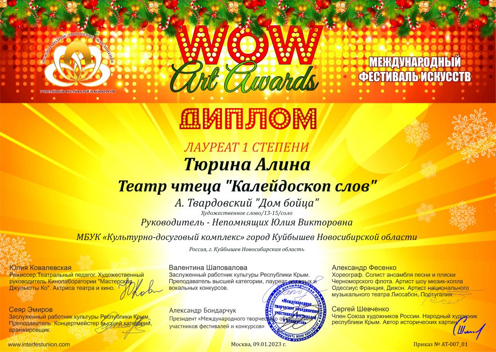 Стали известны результаты Открытого международного фестиваля искусств Wow art awards, организованного Автономной некоммерческой организацией «Международное творческое объединение участников фестивалей и конкурсов». От МБУК «Культурно-досуговый комплекс» в номинации «Художественное слово» в конкурсе приняли участие Алина Тюрина и Артем Долганов (Театр чтеца «Калейдоскоп слов», руководитель Юлия Непомнящих). Жюри оценивало работы по следующим критериям: