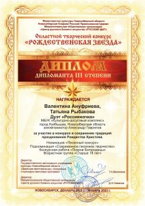 Подведены итоги областного творческого конкурса «Рождественская звезда», организаторами которого являлись Министерство культуры Новосибирской области, Новосибирская Епархия Русской Православной Церкви, Межрегиональная общественная организация «Центр русского боевого искусства «Русский щит». От МБУК «Культурно-досуговый комплекс» в конкурсе принял участие Дуэт вокальной группы «Россияночка» Валентина Ануфриева и Татьяна Рыбакова, руководитель А. Г. Гаврилов. Конкурсная работа дуэта «Покров Богородицы» была удостоена Диплома III степени. Поздравляем! Желаем дальнейших творческих успехов!