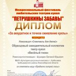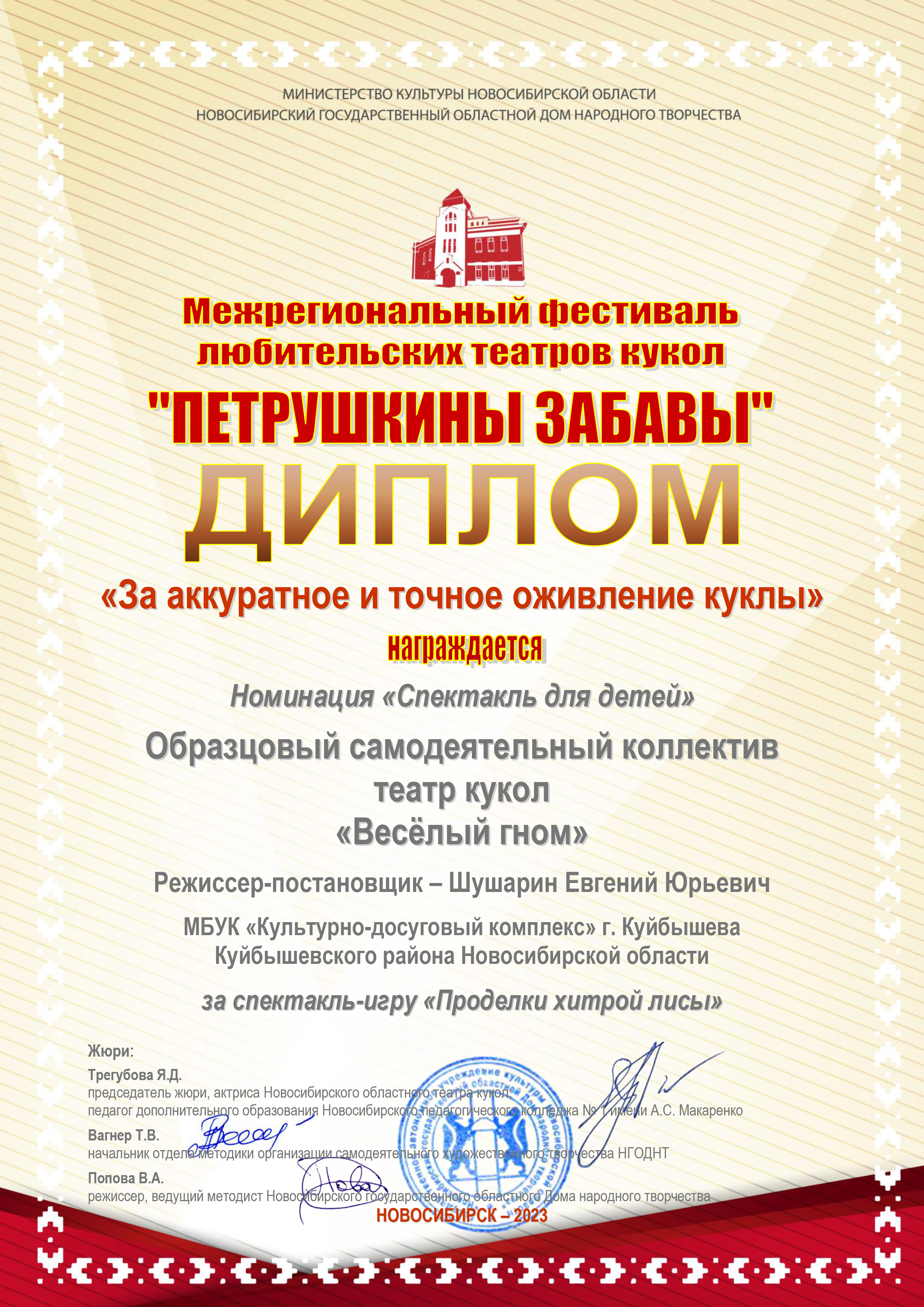 По итогам фестиваля спектакль-игра «Проделки хитрой лисы» Образцового самодеятельного коллектива театр кукол «Веселый гном» удостоена Диплома «За аккуратное и точное оживление куклы». Поздравляем Евгения Юрьевича и его коллектив с достойной наградой, желаем новых побед и достижений!!!