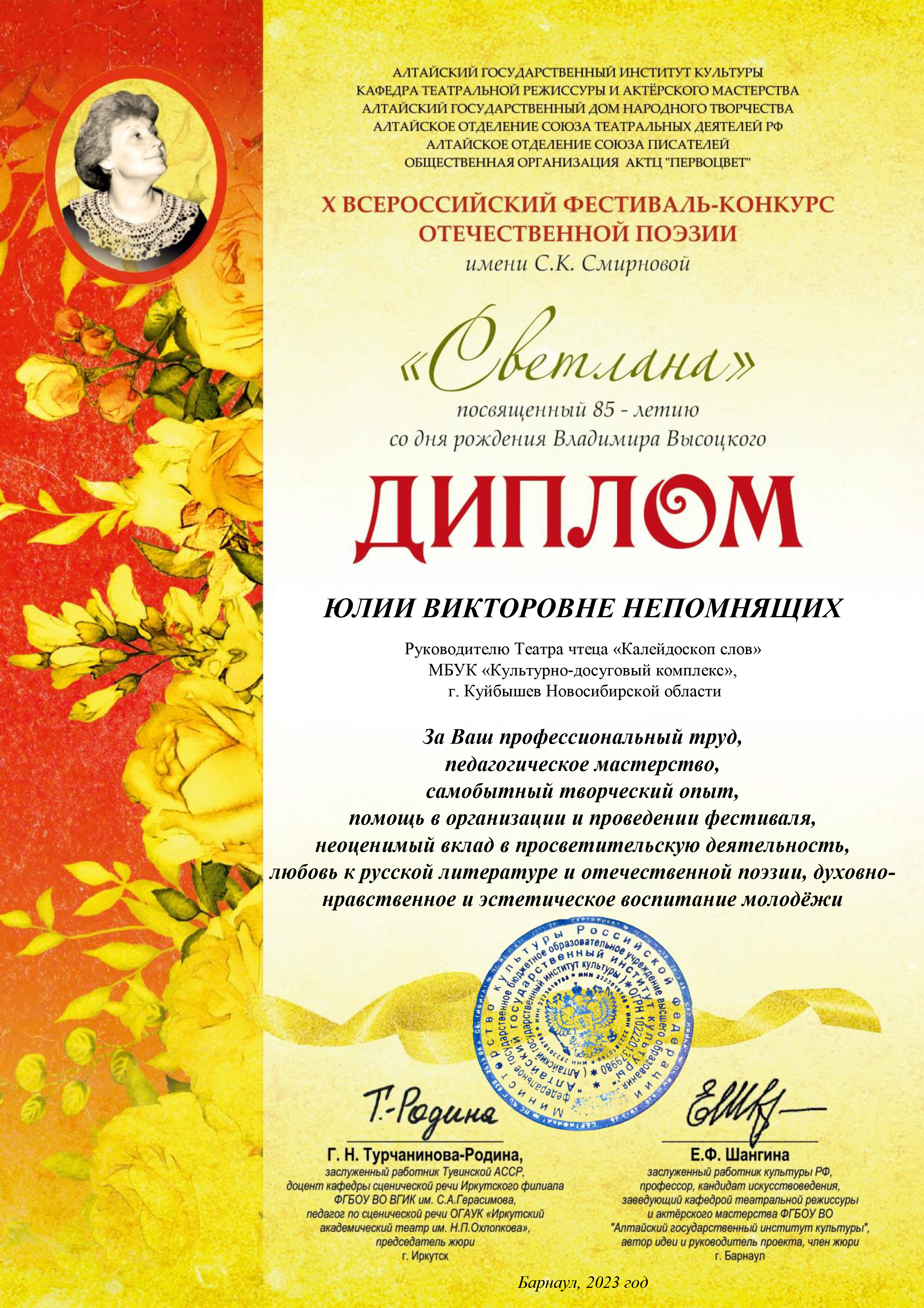 26-27 февраля 2023 года в городе Барнауле состоялся X Всероссийский фестиваль-конкурс Отечественной поэзии «СВЕТЛАНА» им. С.К. Смирновой, посвященный 85-летию со дня рождения Владимира Семёновича Высоцкого, проходил он очно-заочном формате. Учредитель фестиваля — Федеральное Государственное бюджетное образовательное учреждение высшего образования «Алтайский государственный институт культуры», кафедра театральной режиссуры и актерского мастерства; соучредители — Алтайский государственный Дом народного творчества, Алтайское отделение Союза театральных деятелей РФ, Общественная организация «Алтайский краевой театральный центр «Первоцвет».