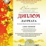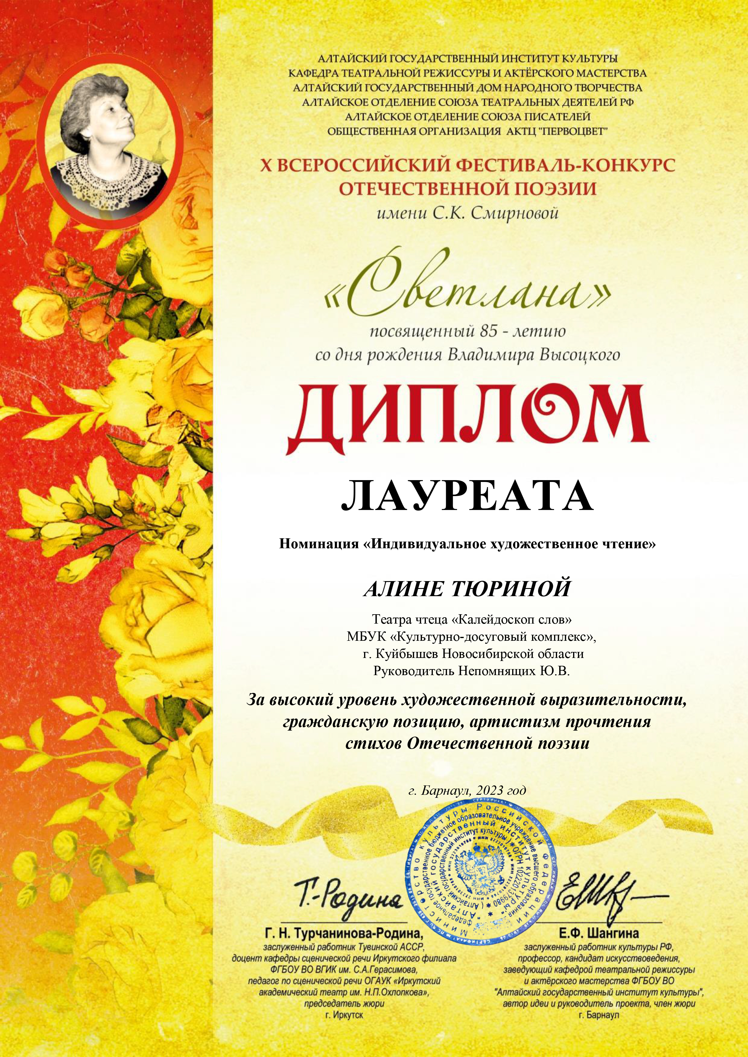 Тюрина Алина лауреат X Всероссийского фестиваля-конкурса Отечественной поэзии «СВЕТЛАНА» им. С.К. Смирновой