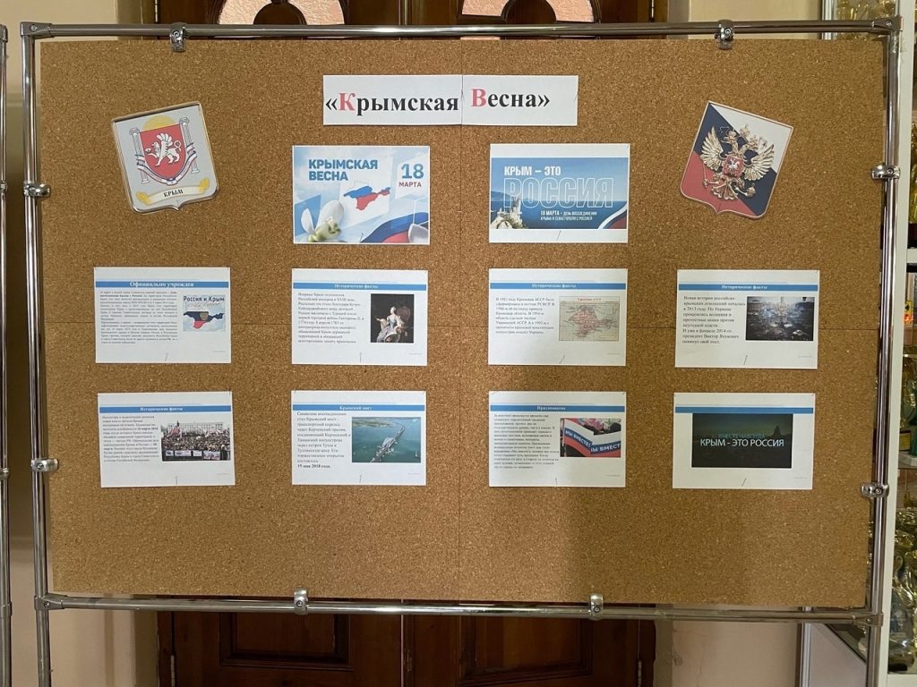 В рамках проведения акции «Крымская весна» специалистами детского сектора МБУК «Культурно-досуговый комплекс» была оформлена информационная выставка «Крымская весна». На выставке представлены материалы об исторических событиях, предопределившее будущее Севастополя и пейзажи красот полуострова Крым.