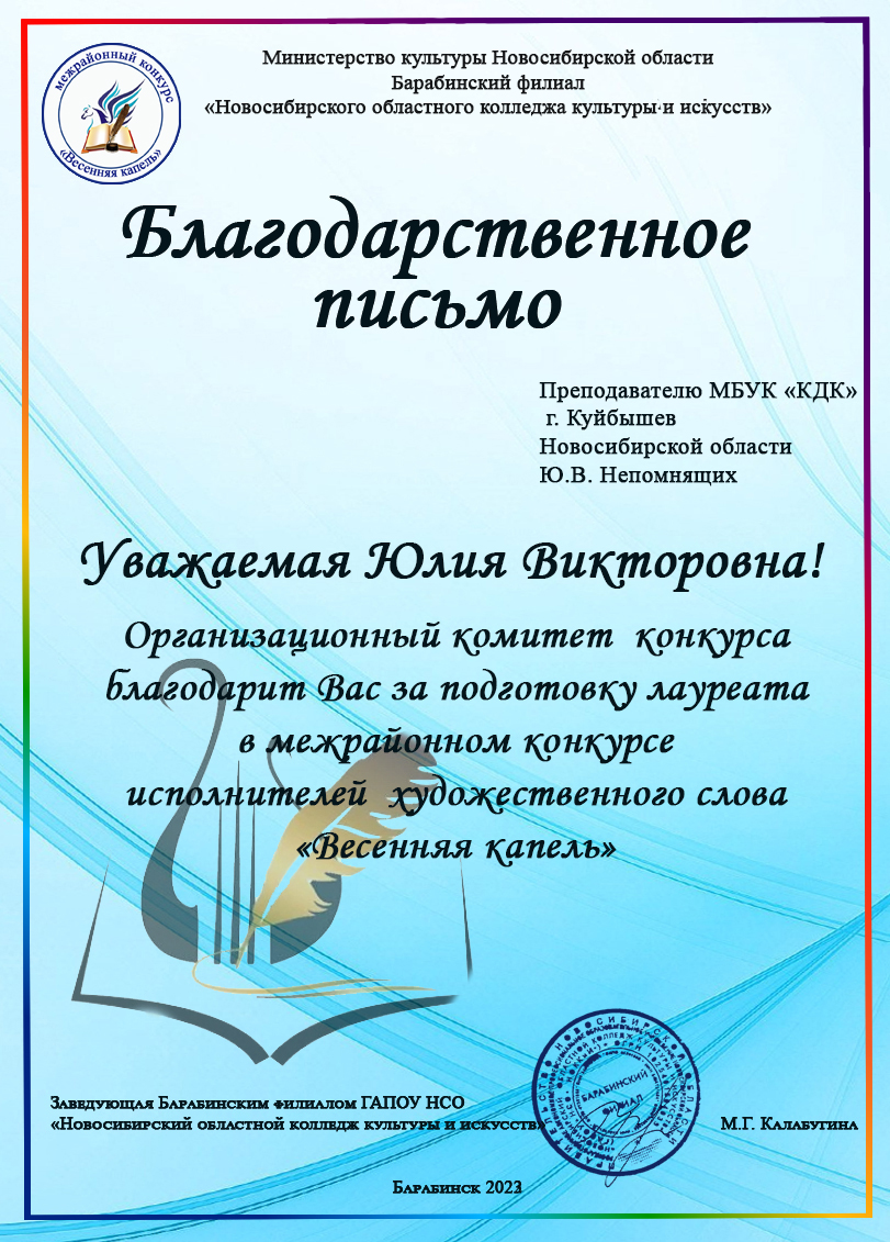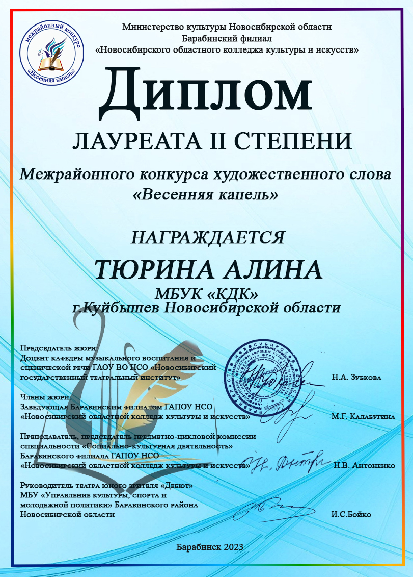 15 марта 2023 года на базе Барабинского филиала Новосибирского областного колледжа культуры и искусств состоялся ежегодный традиционный межрайонный конкурс исполнителей художественного слова «Весенняя капель».