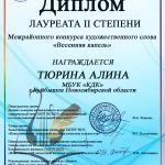 Участница театра чтеца «Калейдоскоп слов» Тюрина Алина приняла участие в конкурсе и стала лауреатом II степени. Поздравляем Алину и руководителя театра Юлию Викторовну Непомнящих с достойной наградой и желаем дальнейших творческих успехов!