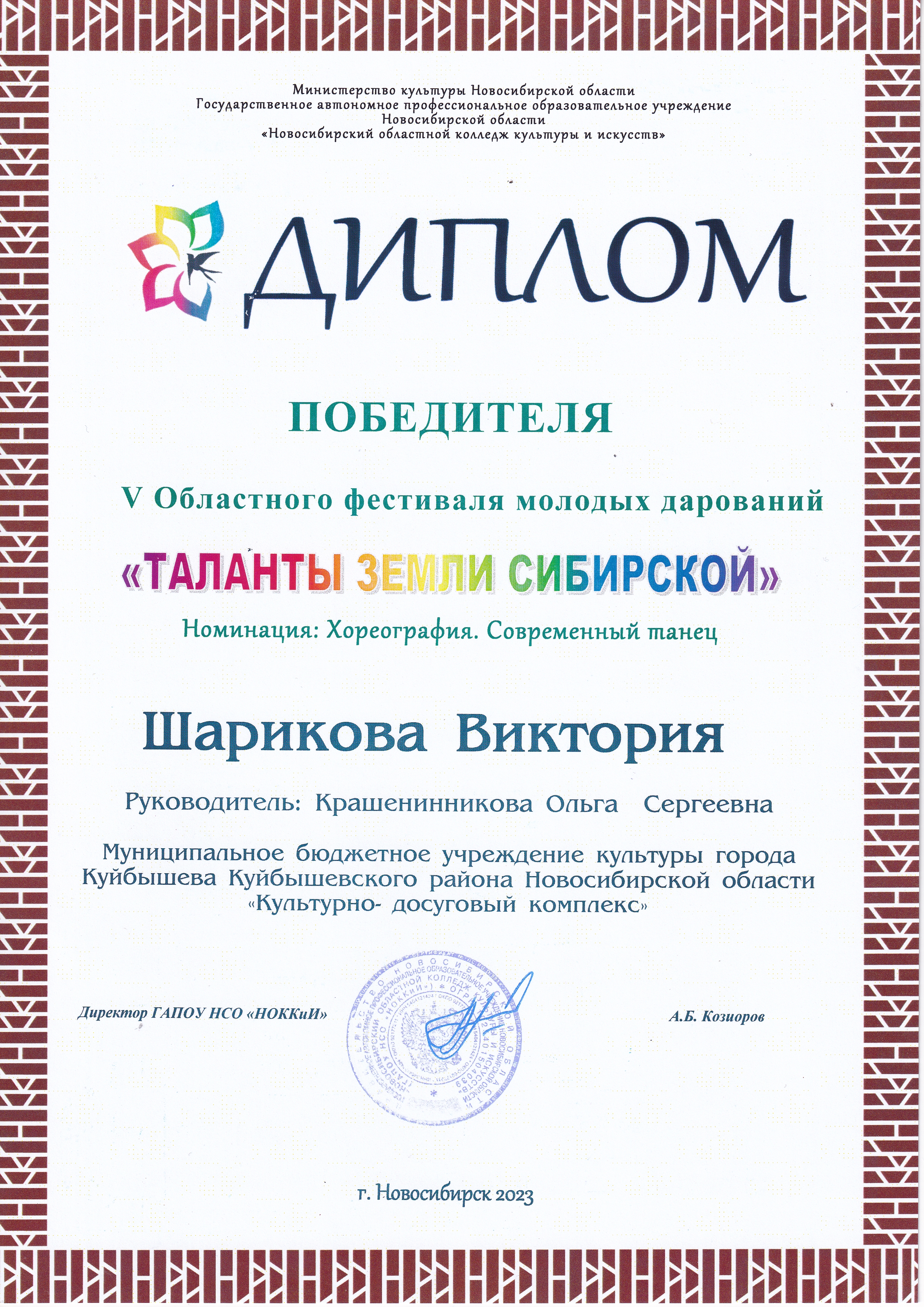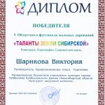 Шарикова Виктория — участница Народного коллектива студии современного танца «Show Dance», руководитель О.С. Крашенинникова, в номинации «Хореография. Современный танец» стала победителем фестиваля. В торжественной обстановке Виктории вручен Диплом, а Ольге Сергеевне Благодарственные письмо.