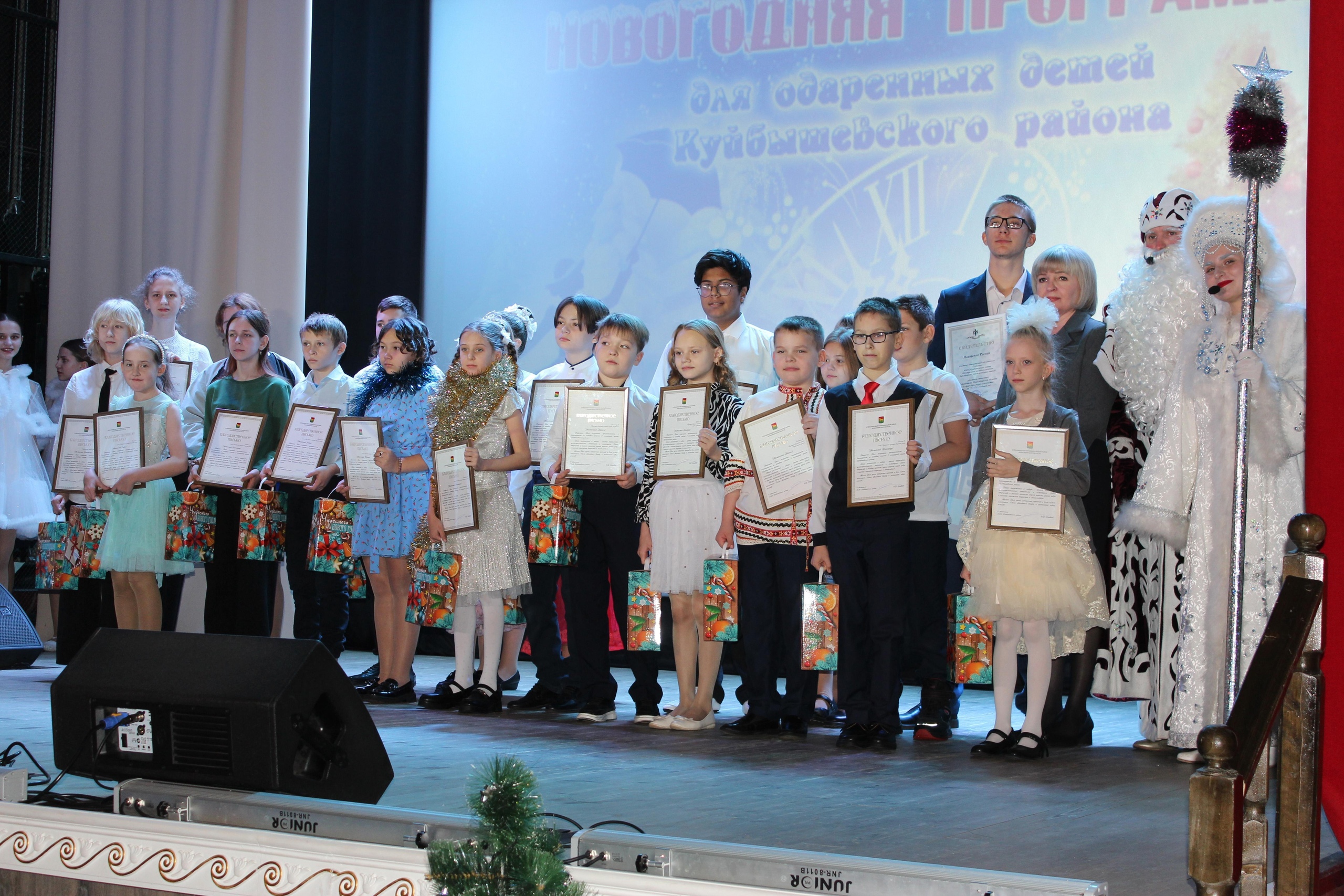 Благодарственные письма Главы Куйбышевского района Олега Караваева ребятам вручили Стефания Отрокова, главный специалист управления культуры, спорта, молодежной политики и туризма администрации Куйбышевского района, Дед Мороз и Снегурочка. В адрес одаренных детей прозвучали слова благодарности за достигнутые результаты.