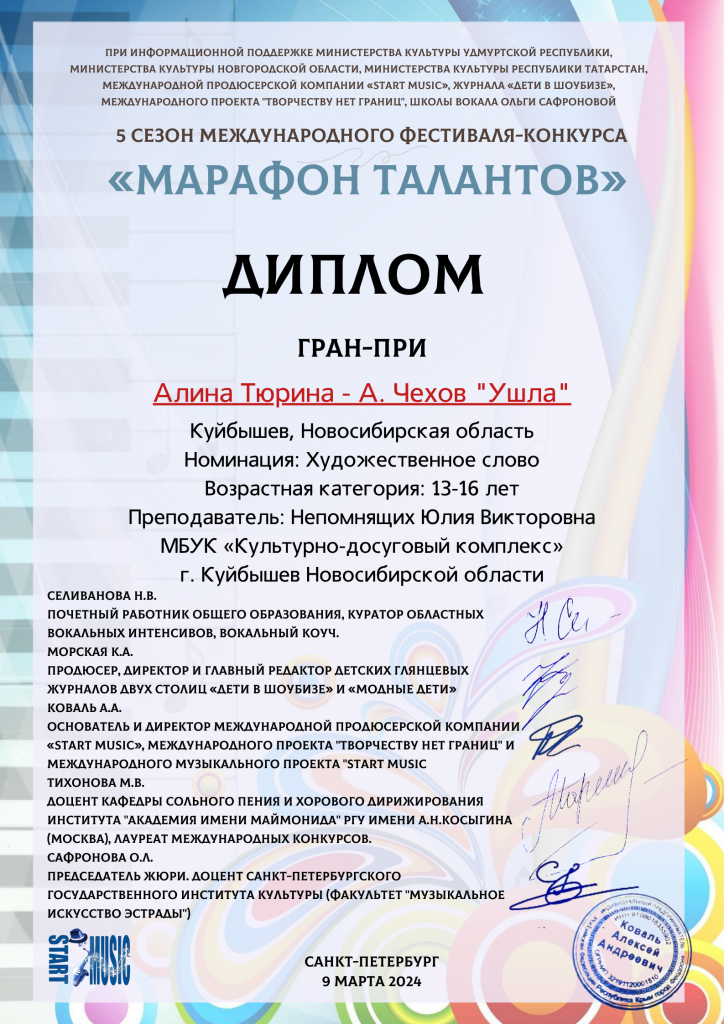 в заочной форме — по видеозаписям и оценивалось профессиональным жюри. В номинации «Художественное слово» в конкурсе принимала участие актриса Театра чтеца «Калейдоскоп слов» (руководитель Юлия Непомнящих) Алина Тюрина и стала лауреатом I степени. Незадолго до этого Алина получила диплом Гран-при за участие в конкурсе «Марафон талантов», организованный этим же творческим объединением. Поздравляем Алину и Юлию Викторовну от всей души! Желаем дальнейших творческих успехов и достижений!