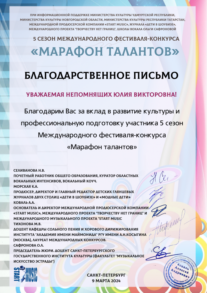 В конце марта стали известны результаты Международного многожанрового конкурса «ФЕНИКС», организованного Международным музыкальным проектом «START MUSIC» (г. Санкт-Петербург). Конкурс проходил при информационной поддержке Министерства культуры субъектов федерации