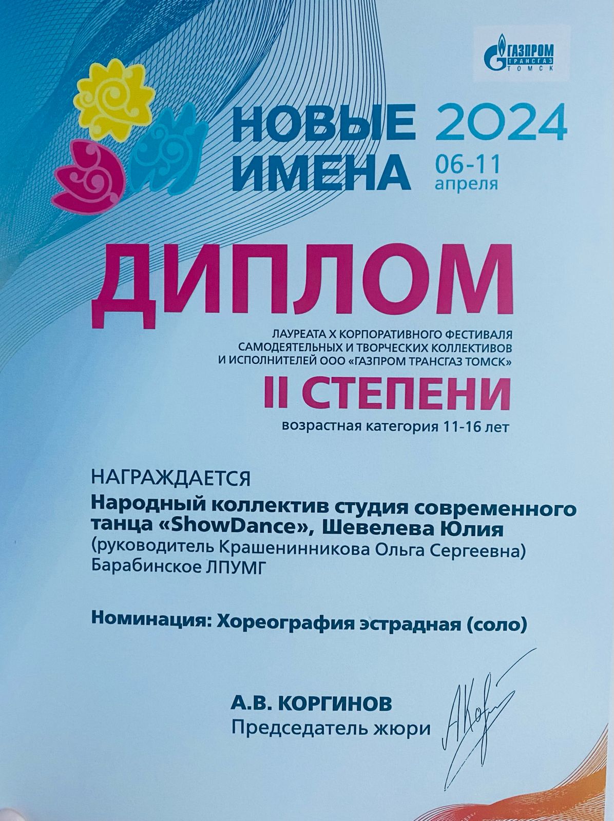 В Томске состоялся X корпоративный фестиваль самодеятельных творческих коллективов и исполнителей ООО «Газпром трансгаз Томск» — «Новые имена», в котором принял участие Народный коллектив студии современного танца «Show Dance» (Крашенинникова О.С.). Фестиваль «Новые имена» стал одним из наиболее значительных событий в культурной жизни региона. Десятый раз он открывает новые таланты, способствует творческому росту артистов. Фестиваль собирает постоянно более тысячи участников. В его орбиту включены танцевальные и вокальные коллективы, сольные исполнители из всех подразделений компании, которые работают в 14-ти регионах Сибири и Дальнего Востока. В состав жюри вошли известные деятели культуры и искусства России. По итогам фестиваля коллектив «Show Dance» награжден дипломом участника, а солистка студии — Шевелева Юлия в возрастной категории 11-16 лет — дипломом Лауреата II степени. От всей души поздравляем Юлю и руководителя Ольгу Сергеевну с достойной наградой и желаем новых высот!
