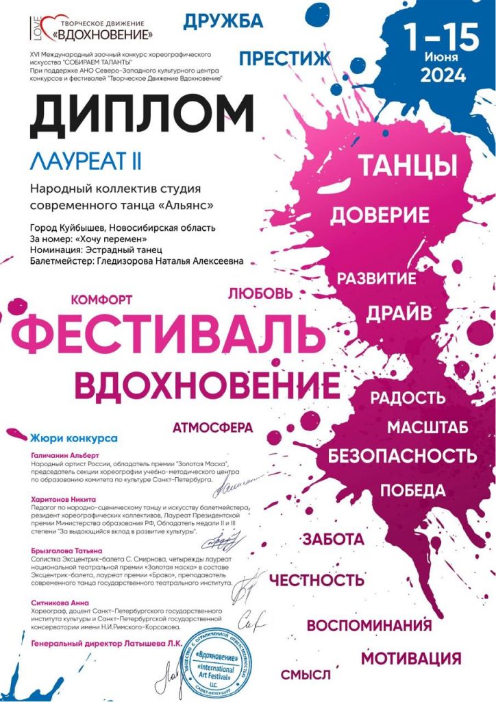 *в номинации «Эстрадный танец» за номер «Хочу перемен» Народный коллектив студия современного танца «Альянс» (балетмейстер Гледизорова Н.А.) удостоен диплома Лауреата II cтепени.