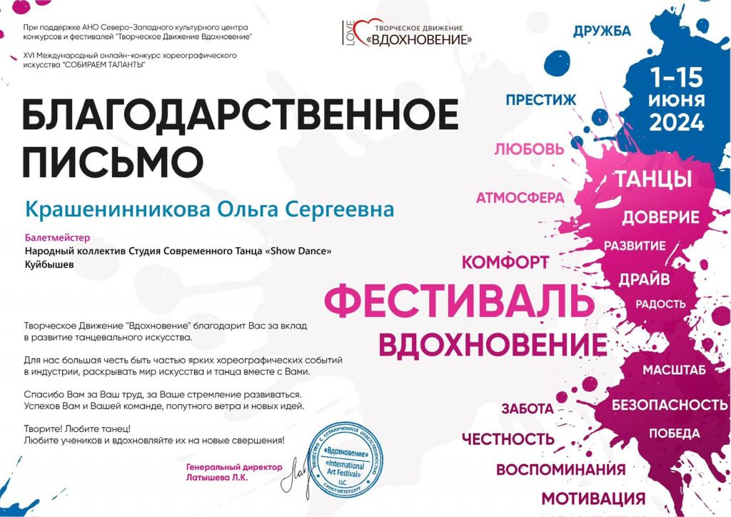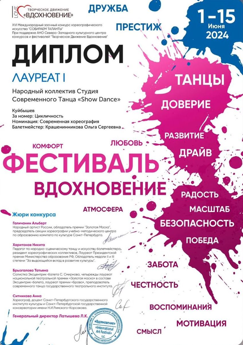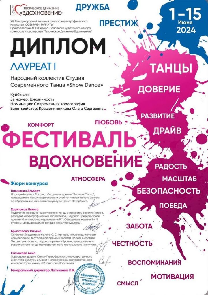*в номинации «Современная хореография» за номер «Цикличность» Народный коллектив студия современного танца «Show Dance» (балетмейстер Крашенинникова О.С.) удостоен диплома Лауреата I cтепени.