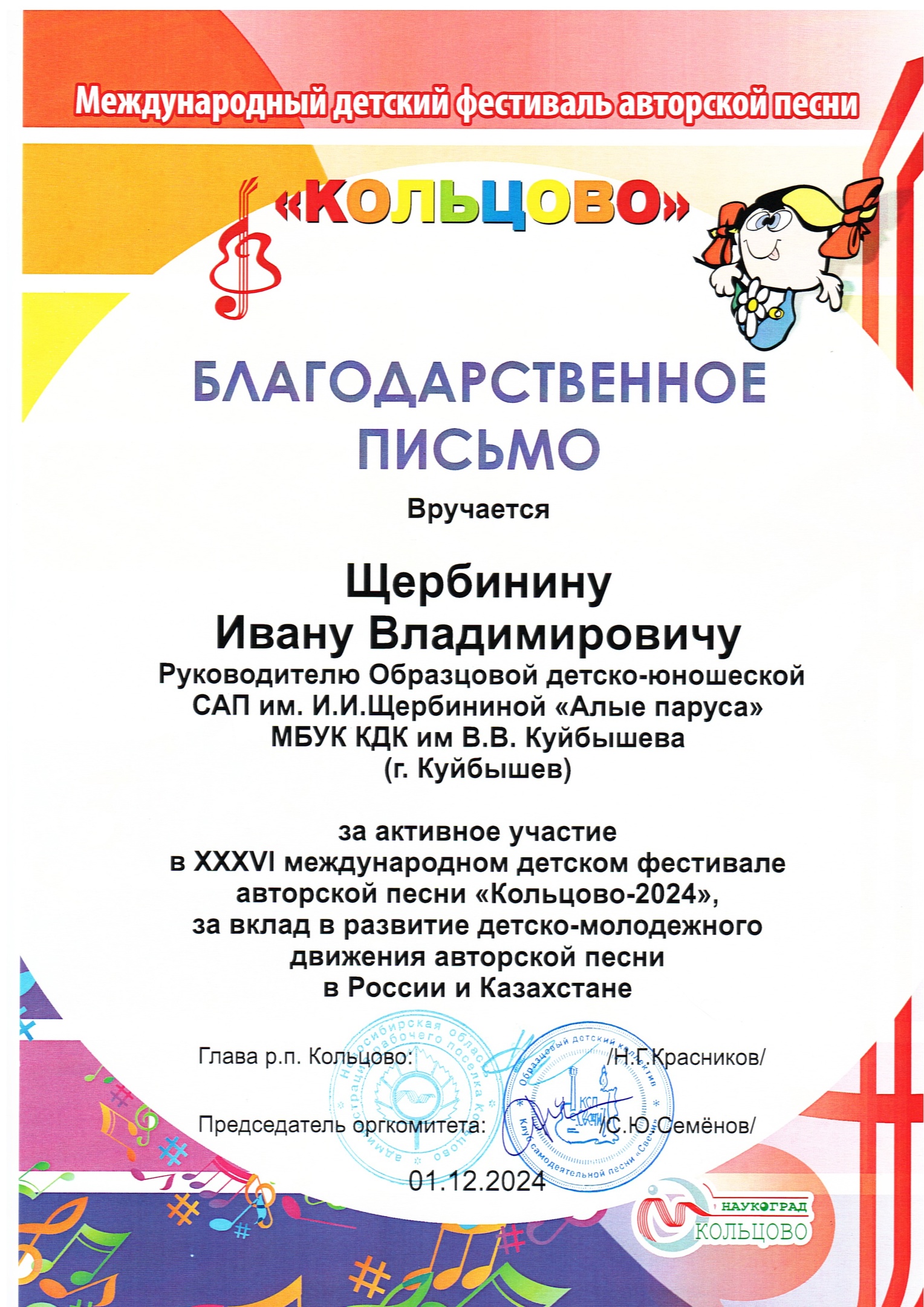 С 28 ноября по 1 декабря 2024 года в Наукограде «Кольцово» состоялся XXXVI Международный детский фестиваль авторской песни «Кольцово–2024», посвященный 35-летию Образцового детского коллектива КСП «Свечи», а также Году семьи.