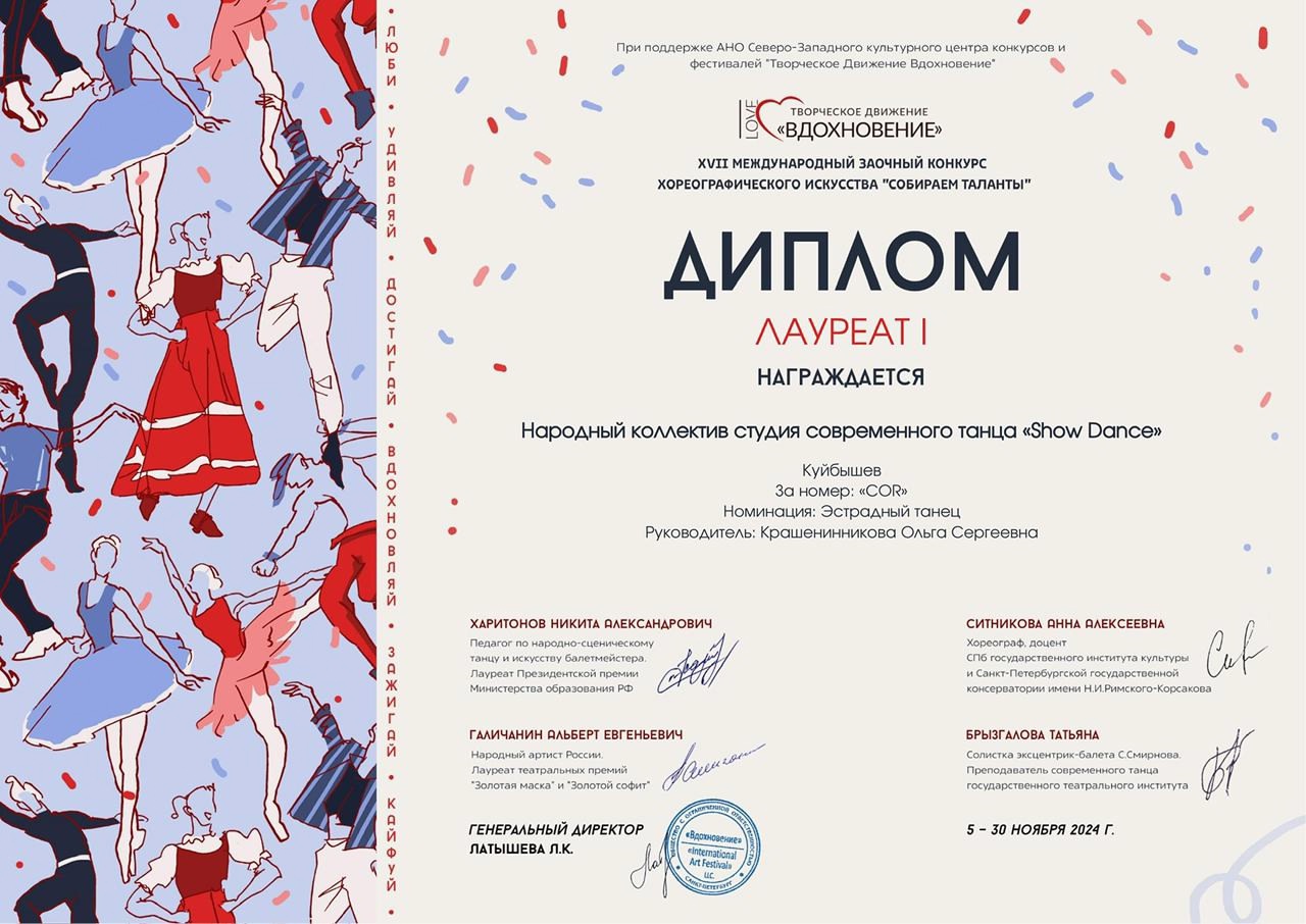 На XVII-м Международном заочном конкурсе хореографического искусства «Собираем таланты» эксперты по достоинству оценили мастерство Народного коллектив студия современного танца «Show Dance» (балетмейстер О.С. Крашенинникова). В номинации «Эстрадный танец» за номер «COR» коллектив завоевал звание Лауреата I степени