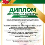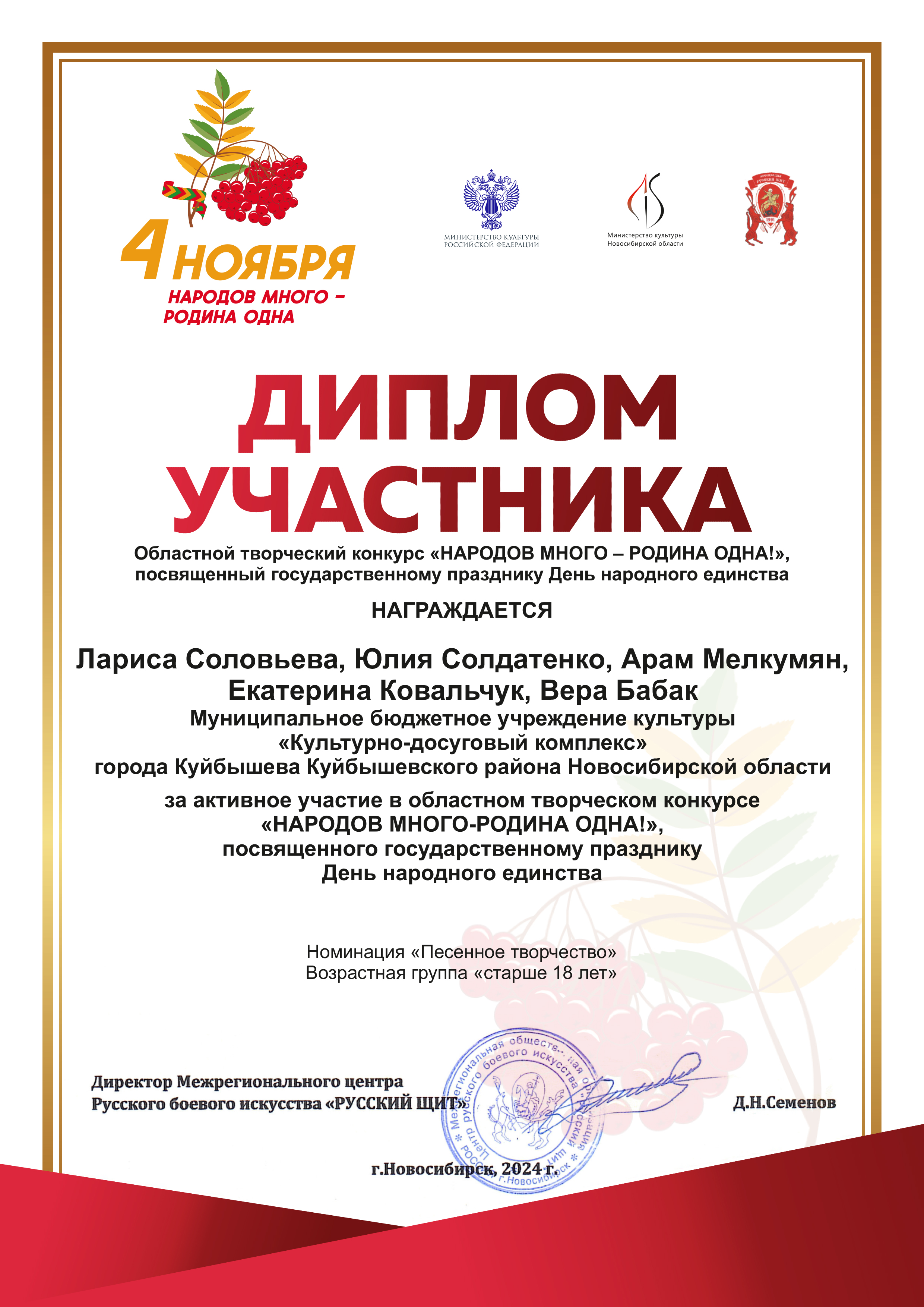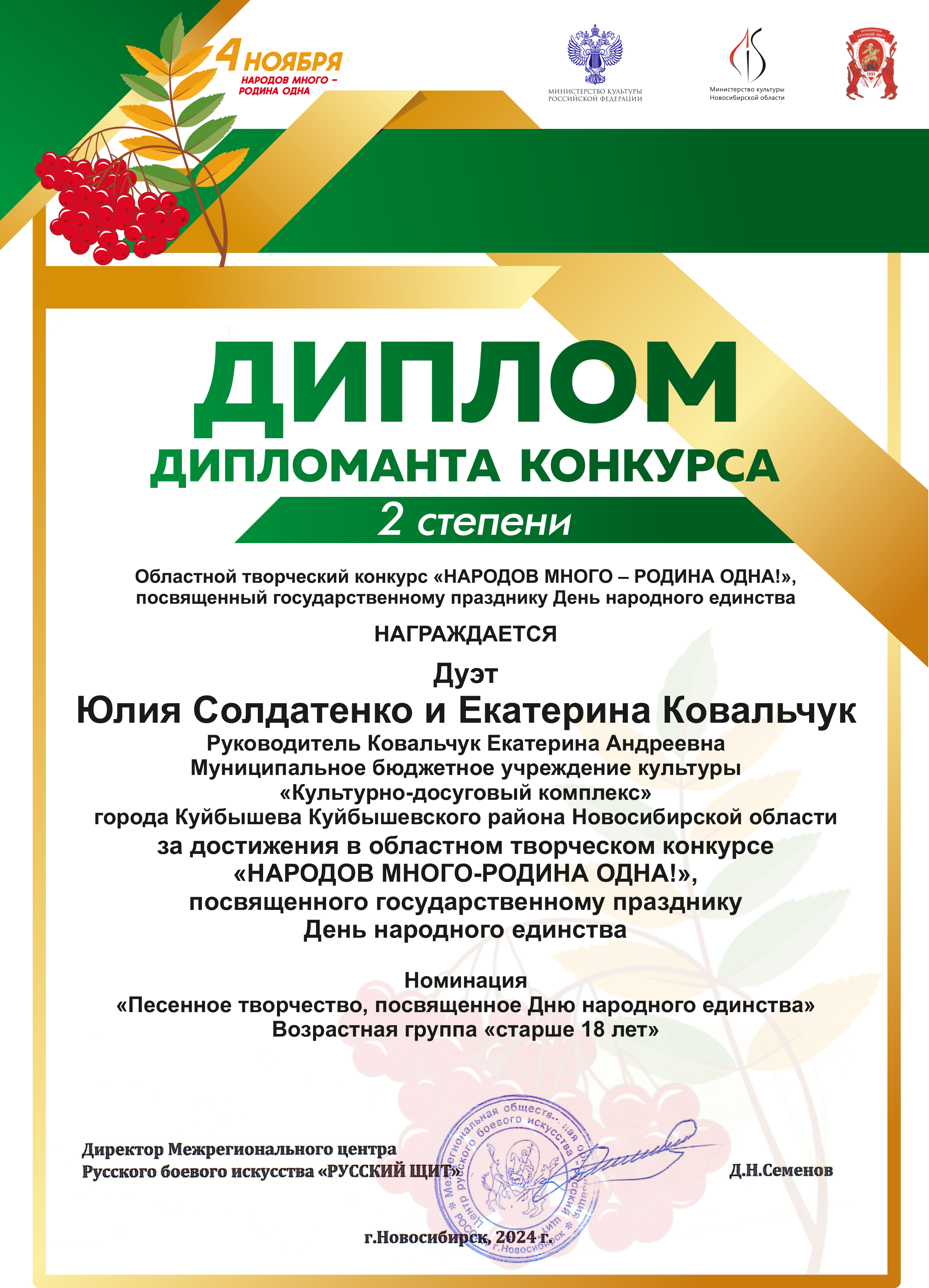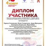 Солисты ДК им.В.В. Куйбышева приняли участие в Областном творческом дистанционном конкурсе «НАРОДОВ МНОГО — РОДИНА ОДНА», посвященном государственному празднику День народного единства, организатором которого является Межрегиональная общественная организация «Центр русского боевого искусства «Русский щит» при поддержке Министерства культуры Российской Федерации, Министерства культуры Новосибирской области. Творческий конкурс направлен на популяризацию и вовлечение в мероприятия, посвященные государственному празднику День народного единства учреждений культуры, образовательных и патриотических организаций, творческих коллективов, жителей Новосибирской области; обновление содержания форм и методов работы по традиционно-культурному и духовно-нравственному воспитанию молодежи. По итогам конкурса Дуэт Екатерина Ковальчук и Юлия Солдатенко награжден дипломом Дипломанта II степени, ансамбль (Лариса Соловьева, юлия Солдатенко, Арам Мелкумян, Екатерина Ковальчук, Вера Бабак) — дипломом участника.