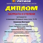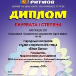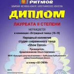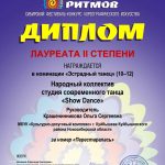 Руководителю коллектива Ольге Сергеевне был вручен Диплом за эстетическое воспитание подрастающего поколения средствами хореографического искусства, а также сертификат на бесплатное участие в одной из номинаций фестиваля-конкурса на следующий год.