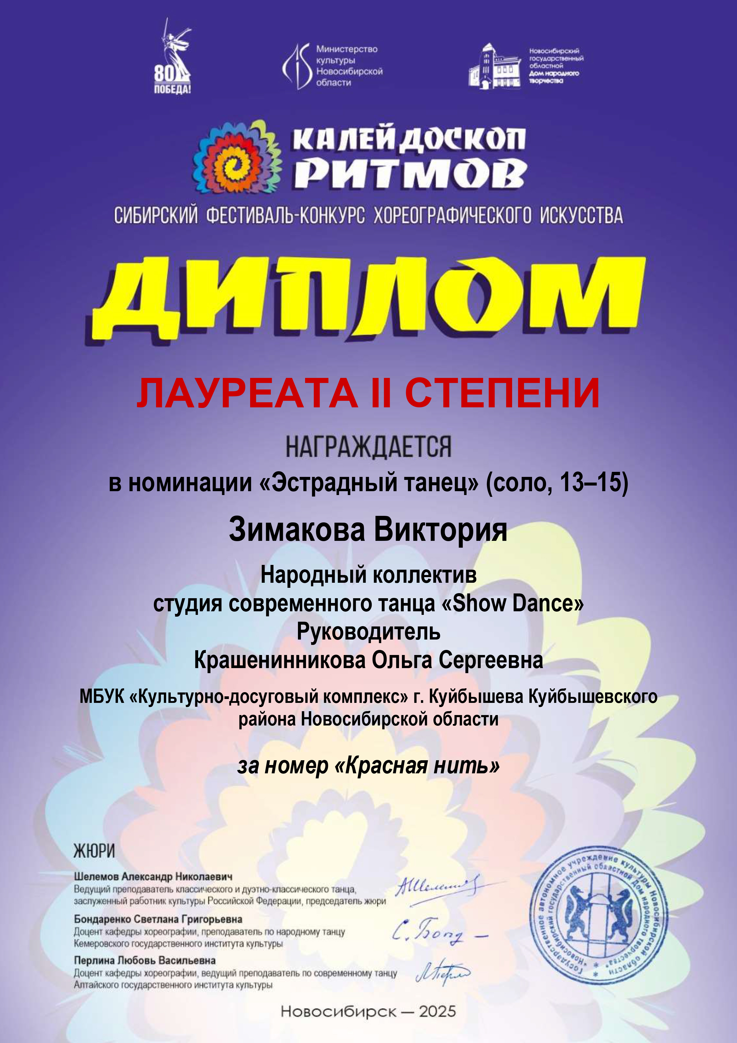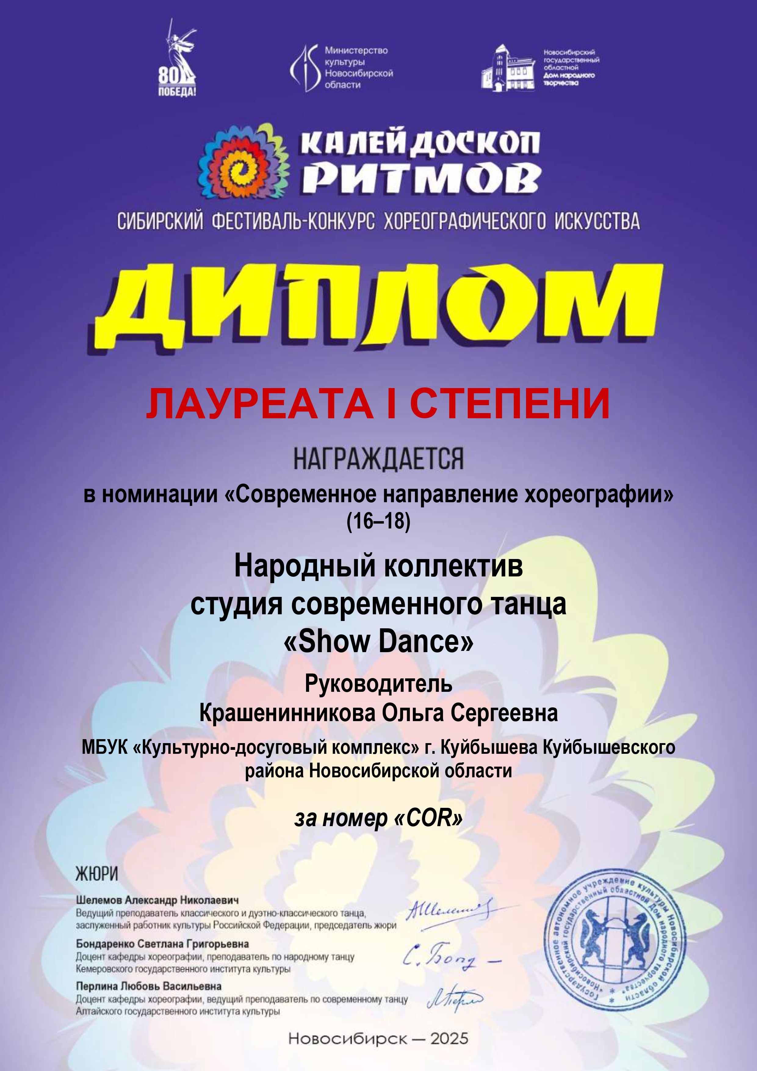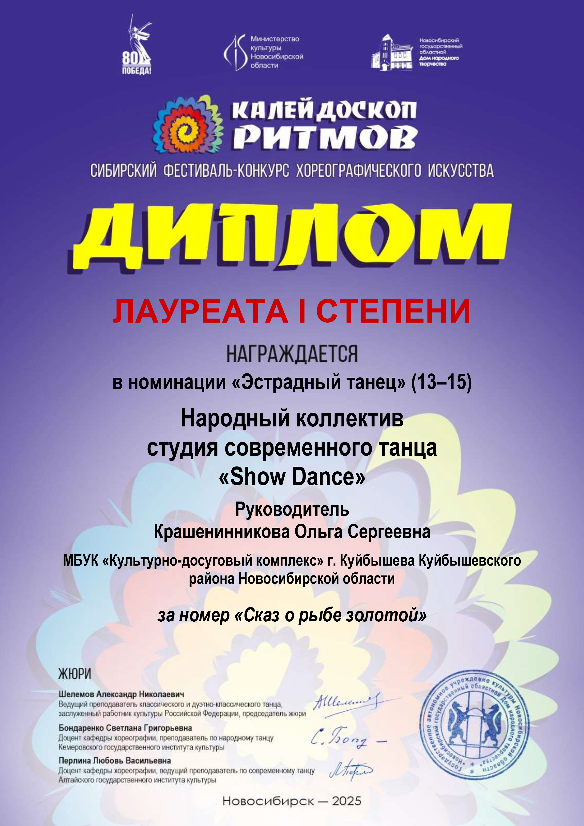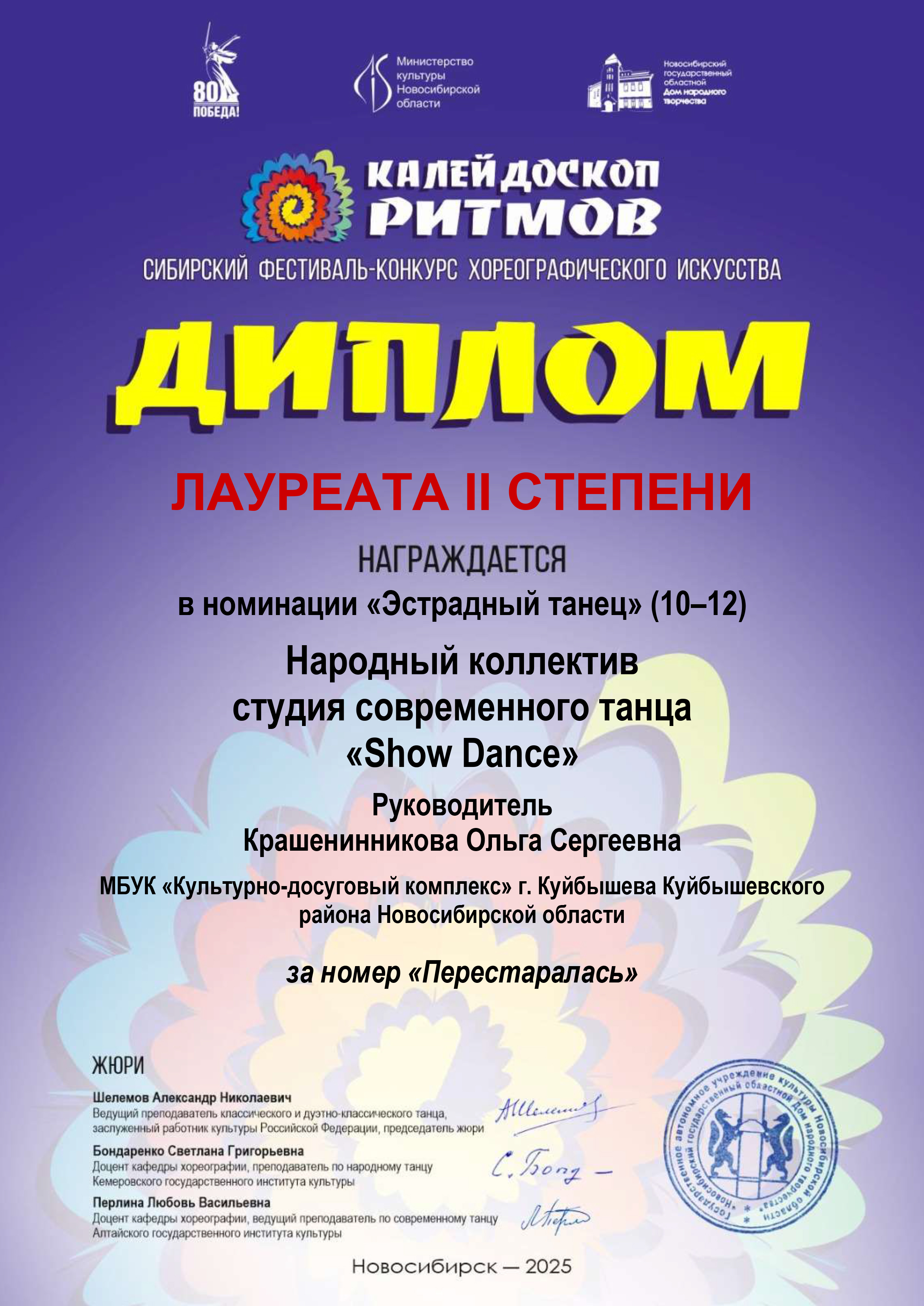 🎉 Поздравляем Народный коллектив студия современного танца «Show Dance» (руководитель О.С. Крашенинникова) с замечательными результатами на Сибирском фестивале-конкурсе хореографического искусства «Калейдоскоп ритмов»! 🎉