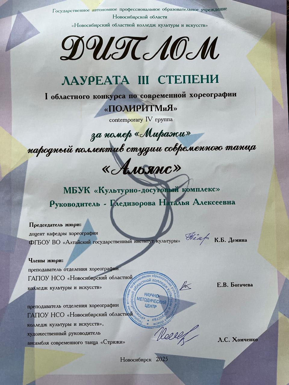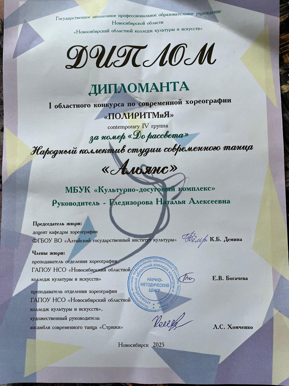 С 4 по 5 апреля 2025 года в г. Новосибирске состоялся I областной конкурс современного танца «ПОЛИРИТМиЯ», организованный Новосибирским областным колледжем культуры и искусств при поддержке Министерства культуры Новосибирской области. Конкурс прошёл с большим успехом, собрав талантливых танцоров и зрителей со всей области. Это событие стало ярким примером художественного самовыражения и культурного обмена, предоставив участникам возможность продемонстрировать свои навыки и креативность. На конкурсе представили свои работы как профессиональные танцевальные коллективы, так и любители. Каждое выступление было уникальным, отражая индивидуальность и стиль участников. Танцевальные номера включали различные направления.